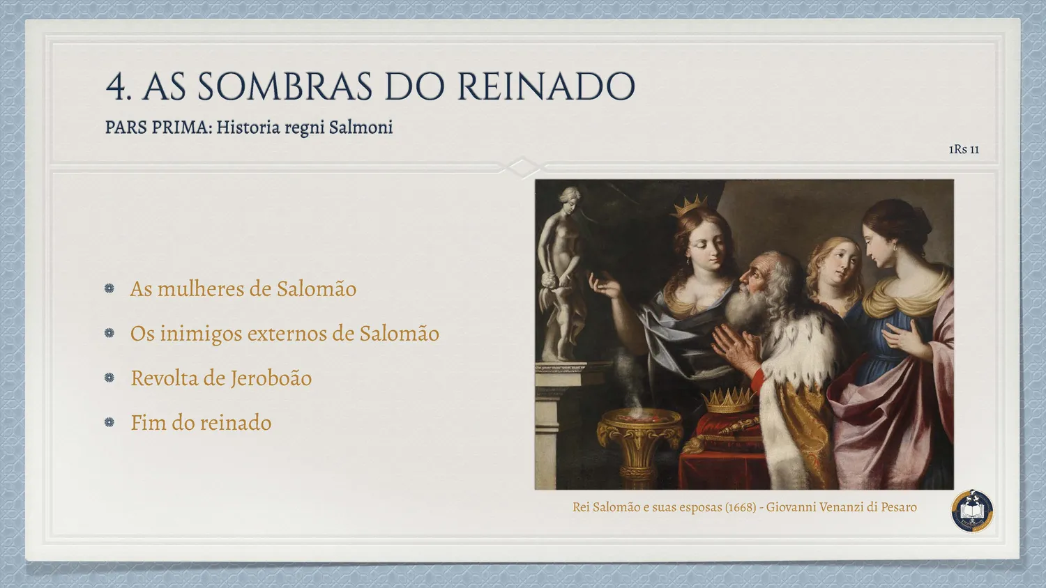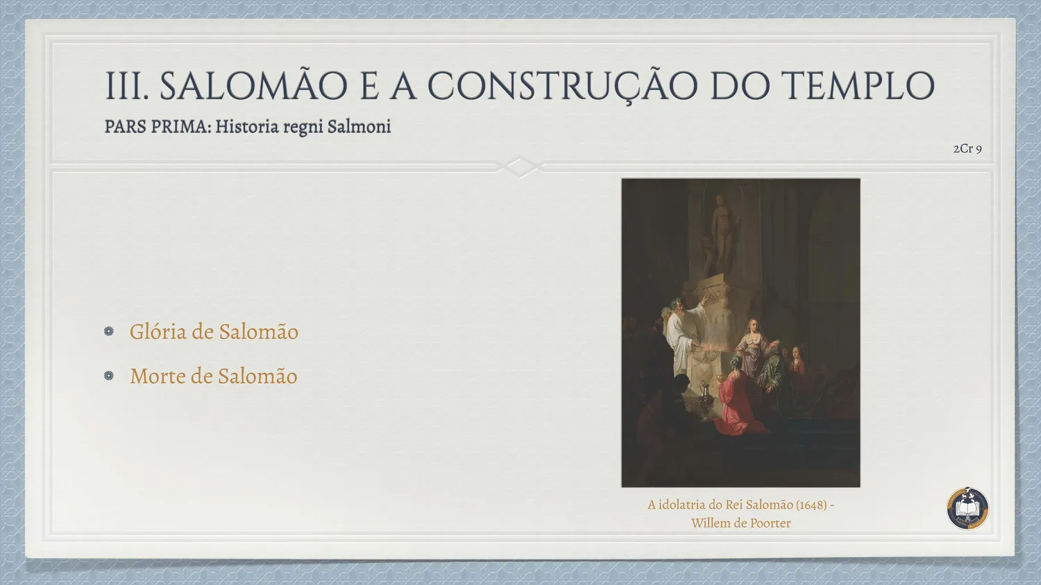 Eu estava ali na eternidade que recebe Salomão: julguei-o como rei, mas abracei-o como filho. Eu estava ali quando o passado se inclinava sobre si mesmo, fechando tronos que caíam e abrindo caminhos ao que viria; falei ao céu, e ele se fechou — não por ira, mas por amor (cf. 2Cr 20,22–23).
