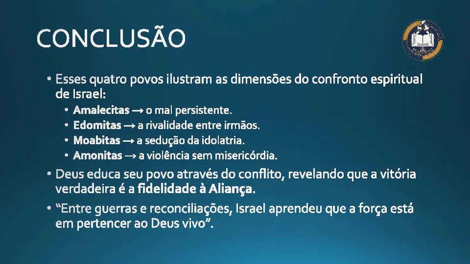 Deus usou cada confronto como lição: Israel não devia vencer apenas exércitos, mas também o orgulho, a vingança e a autossuficiência. A verdadeira vitória não está na espada, mas na fidelidade à Aliança. Mesmo entre os inimigos, o Senhor faz surgir instrumentos de Sua salvação.