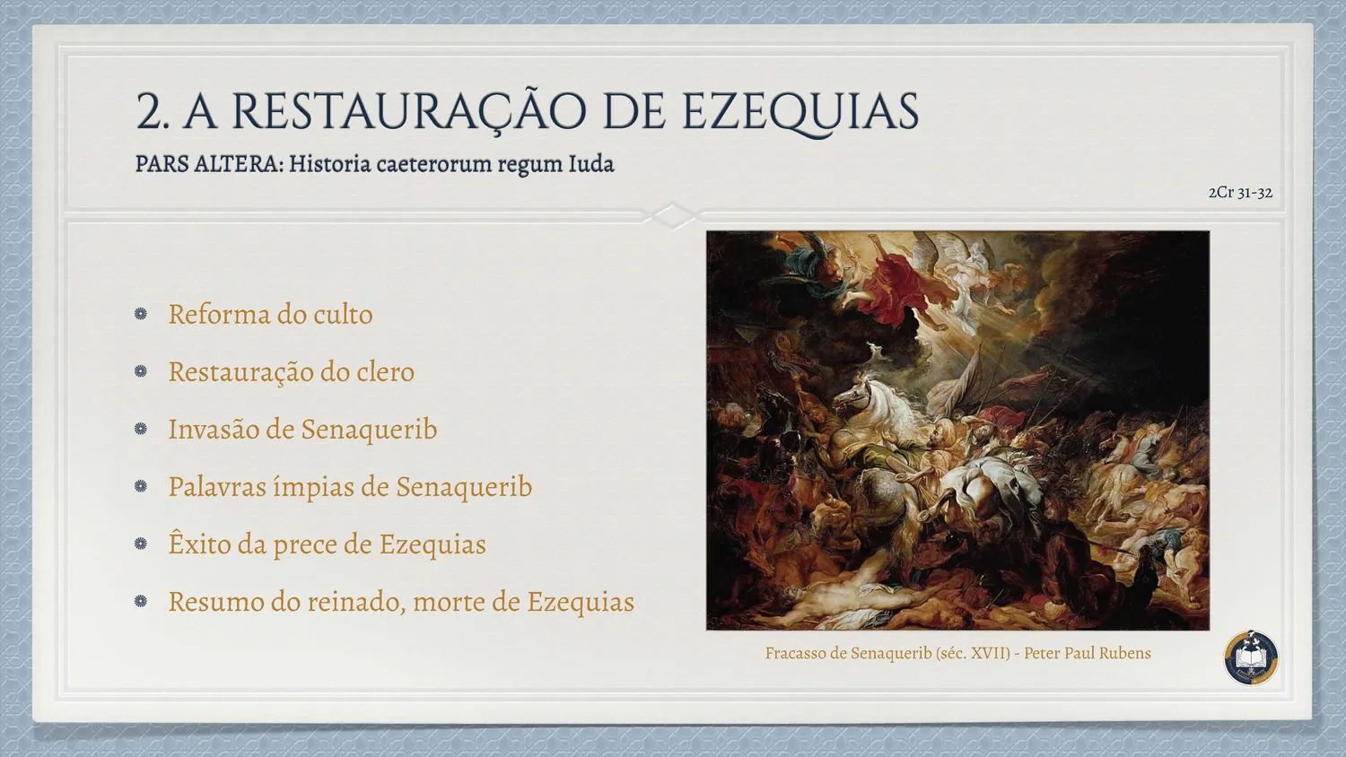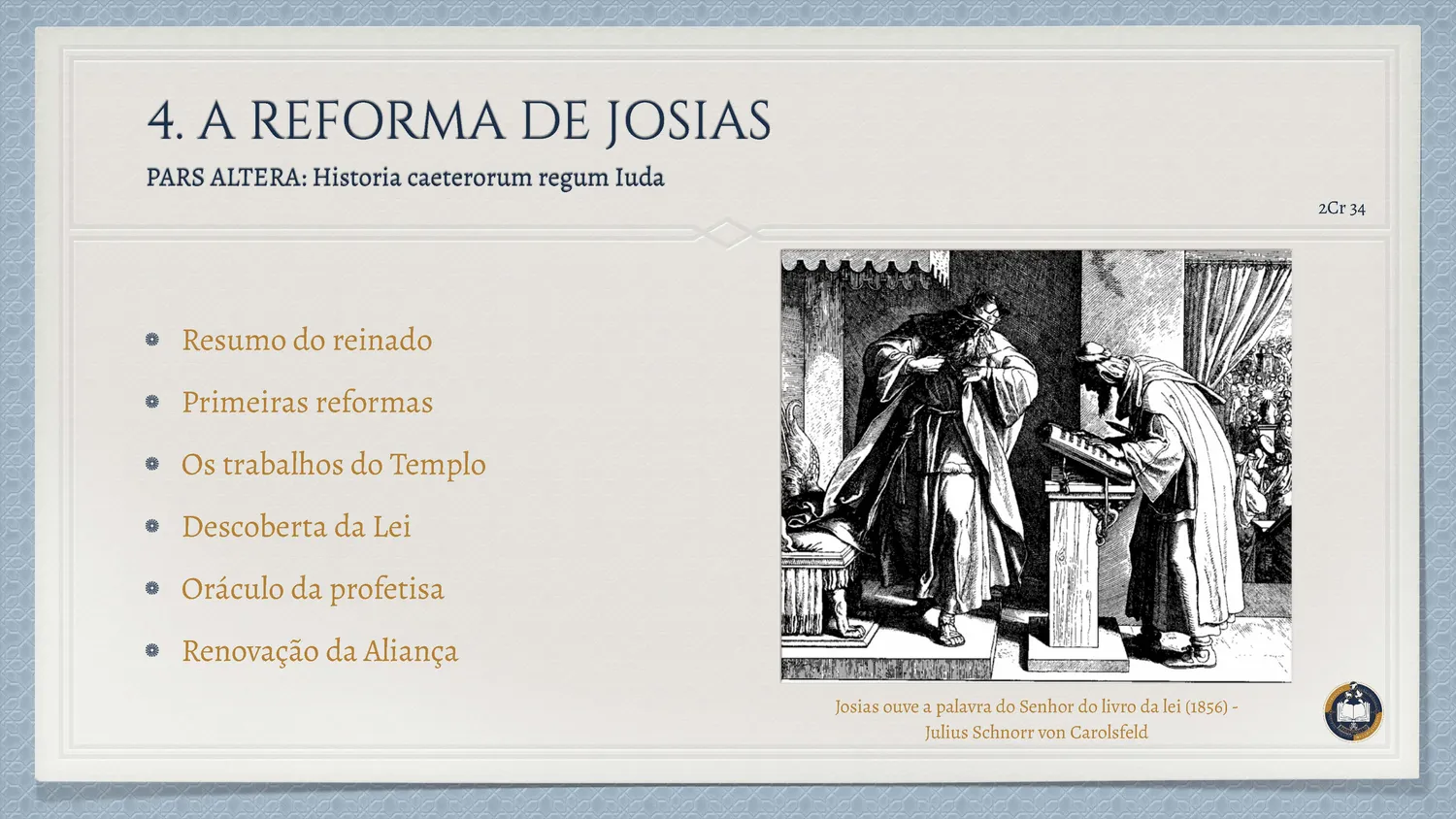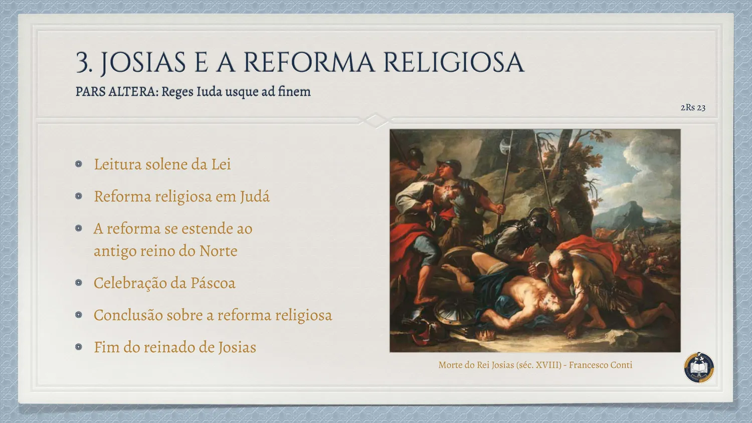 O reinado de Josias inaugura um novo momento de esperança. A descoberta do Livro da Lei provoca uma profunda reforma religiosa, conduzindo o rei e o povo à renovação da Aliança.