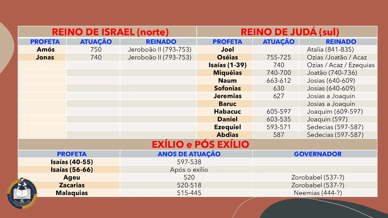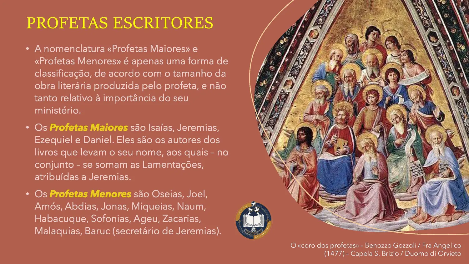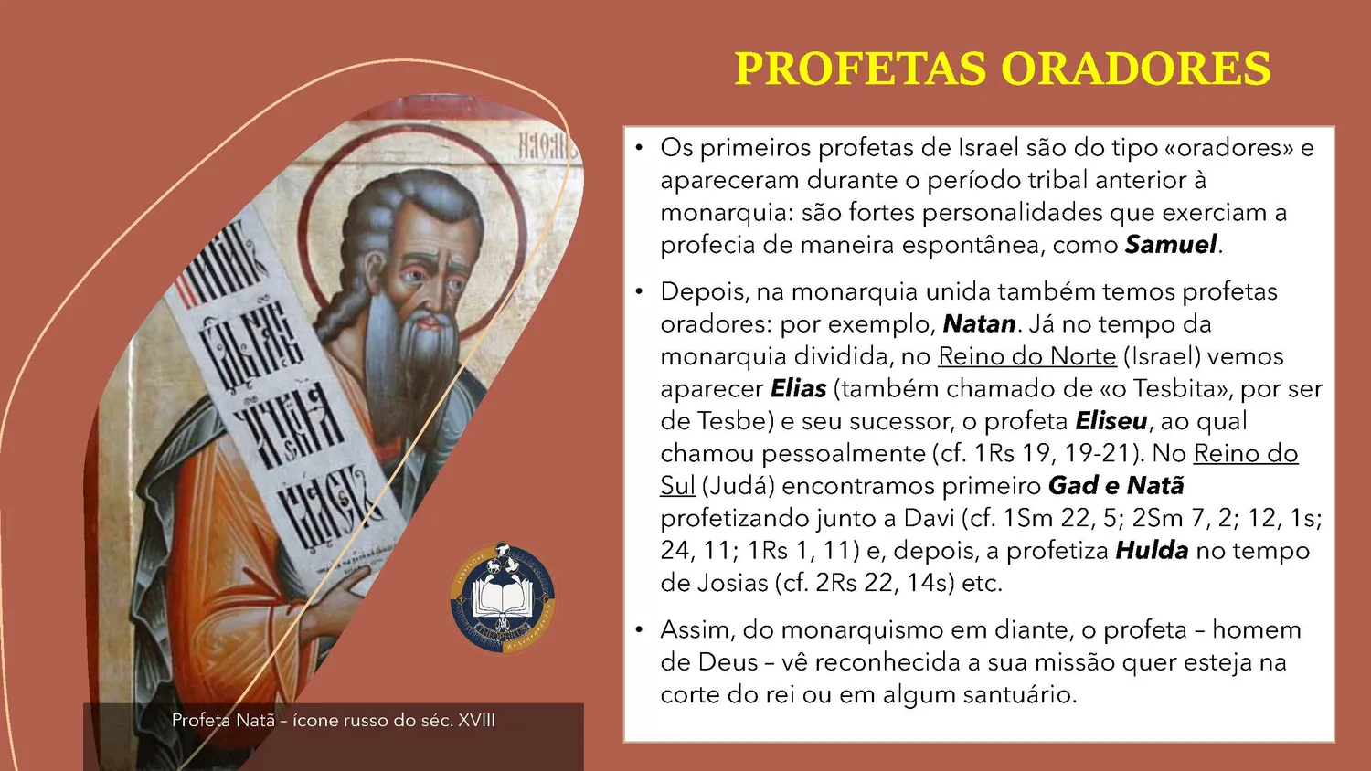 O profetismo em Israel manifesta-se de formas diversas ao longo da história da salvação. Nesta etapa, aprofunda-se a distinção entre profetas oradores e escritores, bem como sua atuação histórica no Reino do Norte, no Reino do Sul e no período do exílio e pós-exílio. Essa classificação permite compreender a evolução e a riqueza da missão profética.