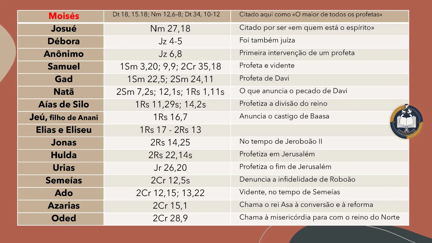 Outros nomes relevantes incluem Moisés, Josué, Débora, Gad, Aías de Silo, Jeú, Semeías, Azarias, Oded e Urias.