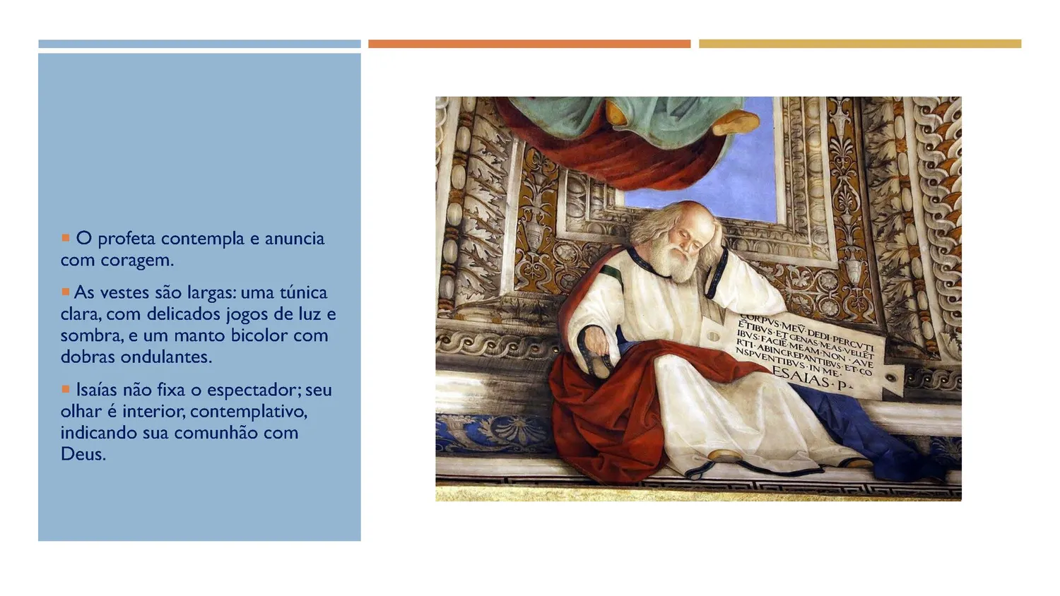 Isaías é representado como um homem idoso, de cabelos grisalhos e expressão recolhida. Sua cabeça inclinada e apoiada na mão esquerda sugere meditação e escuta interior. A mão direita aponta para baixo, em gesto de advertência, indicando a seriedade da mensagem profética.