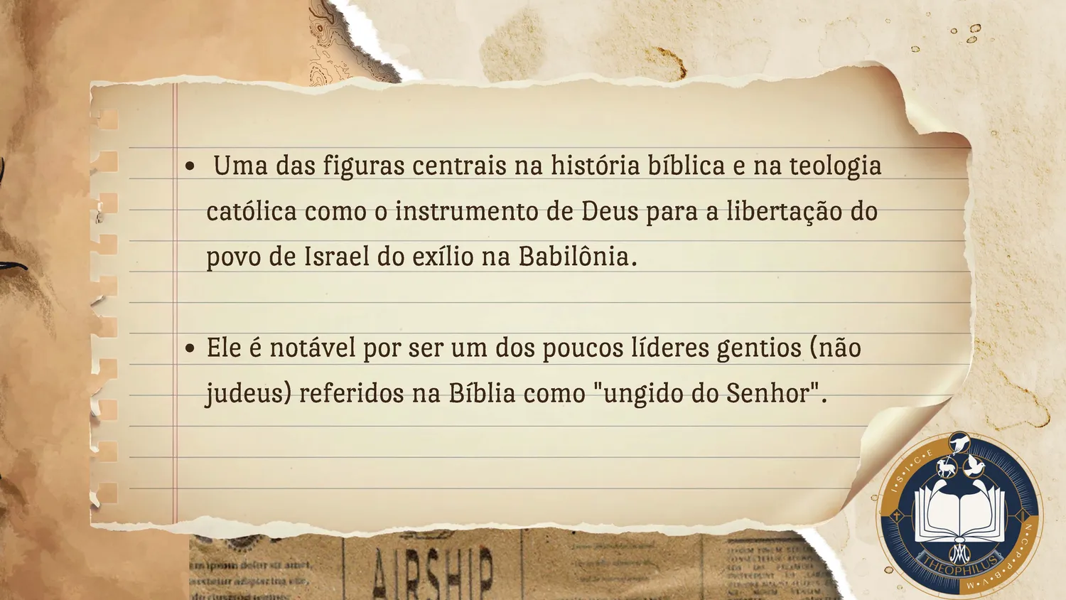 Na Sagrada Escritura, Ciro ocupa um lugar singular: mesmo sendo estrangeiro, é reconhecido como instrumento de Deus para libertar o povo de Israel do exílio na Babilônia. Ele é chamado, de modo surpreendente, de “ungido do Senhor”, revelando que a ação de Deus ultrapassa fronteiras e expectativas humanas.