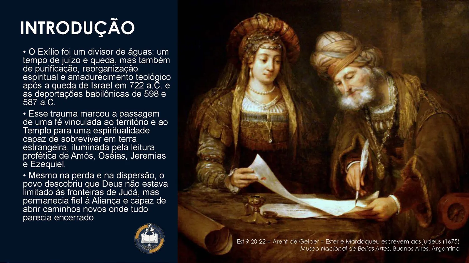 O Exílio foi um divisor de águas na história bíblica. A queda de Israel (722 a.C.) e a destruição de Jerusalém com as deportações babilônicas (598 e 587 a.C.) marcaram o colapso político dos reinos, mas também inauguraram um tempo de purificação espiritual e amadurecimento teológico. A fé, antes fortemente ligada ao território e ao Templo, aprendeu a sobreviver em terra estrangeira, sustentada pela Palavra e pela esperança profética.