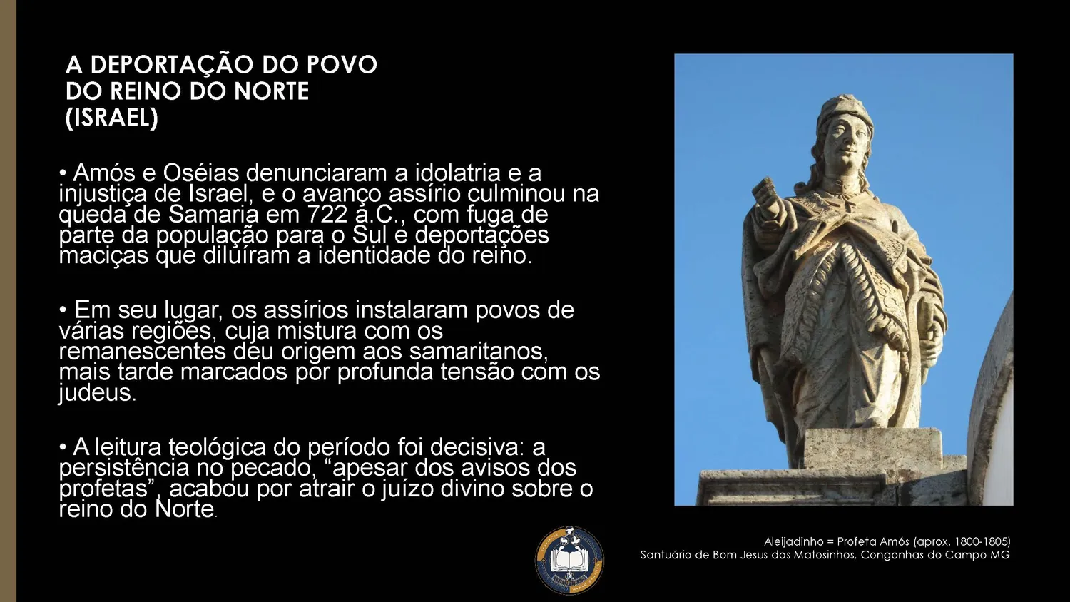 Após repetidas denúncias de idolatria e injustiça feitas por Amós e Oséias, Samaria caiu diante da Assíria (cf. 2Rs 17). Parte da população fugiu para o Sul; muitos foram deportados e substituídos por povos estrangeiros, originando os samaritanos. A leitura teológica foi clara: a persistência no pecado, apesar dos avisos proféticos, conduziu ao juízo divino.