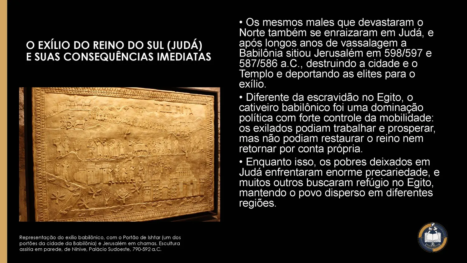 Judá repetiu os erros do Norte. Após anos de vassalagem, Jerusalém foi sitiada e o Templo destruído (cf. 2Rs 24–25). As elites foram deportadas para a Babilônia. Diferentemente da escravidão egípcia, o exílio babilônico foi uma dominação política com possibilidade de trabalho e organização comunitária, mas sem autonomia ou liberdade de retorno.
