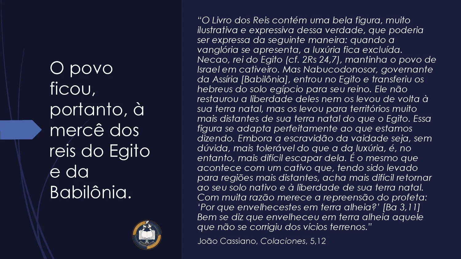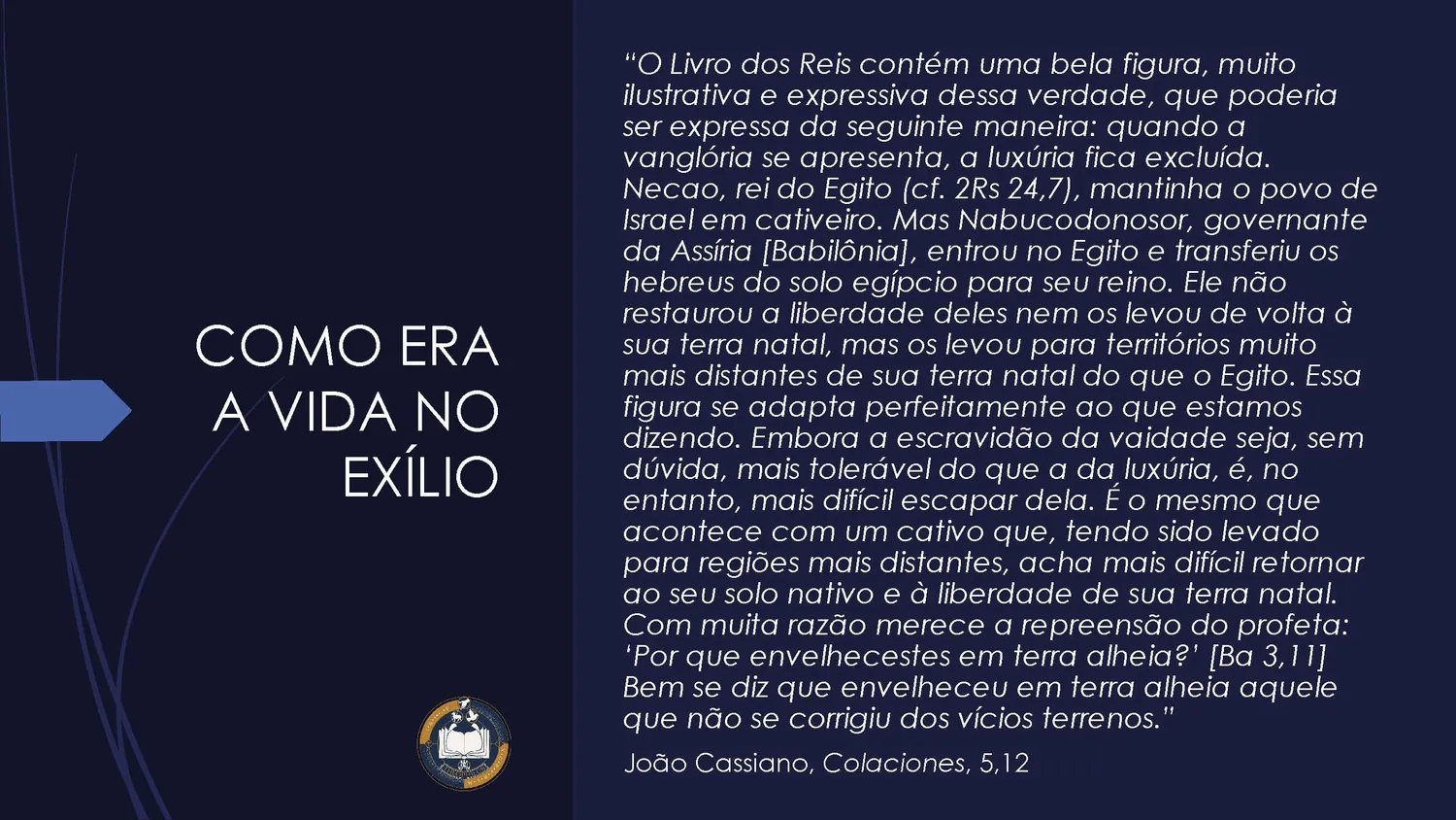 O exílio antecipa, de modo misterioso, o caminho da cruz. O sofrimento vivido pelo povo prepara a compreensão de que Deus pode transformar a dor em caminho de salvação. Assim, aquilo que parecia derrota torna-se instrumento da ação divina.