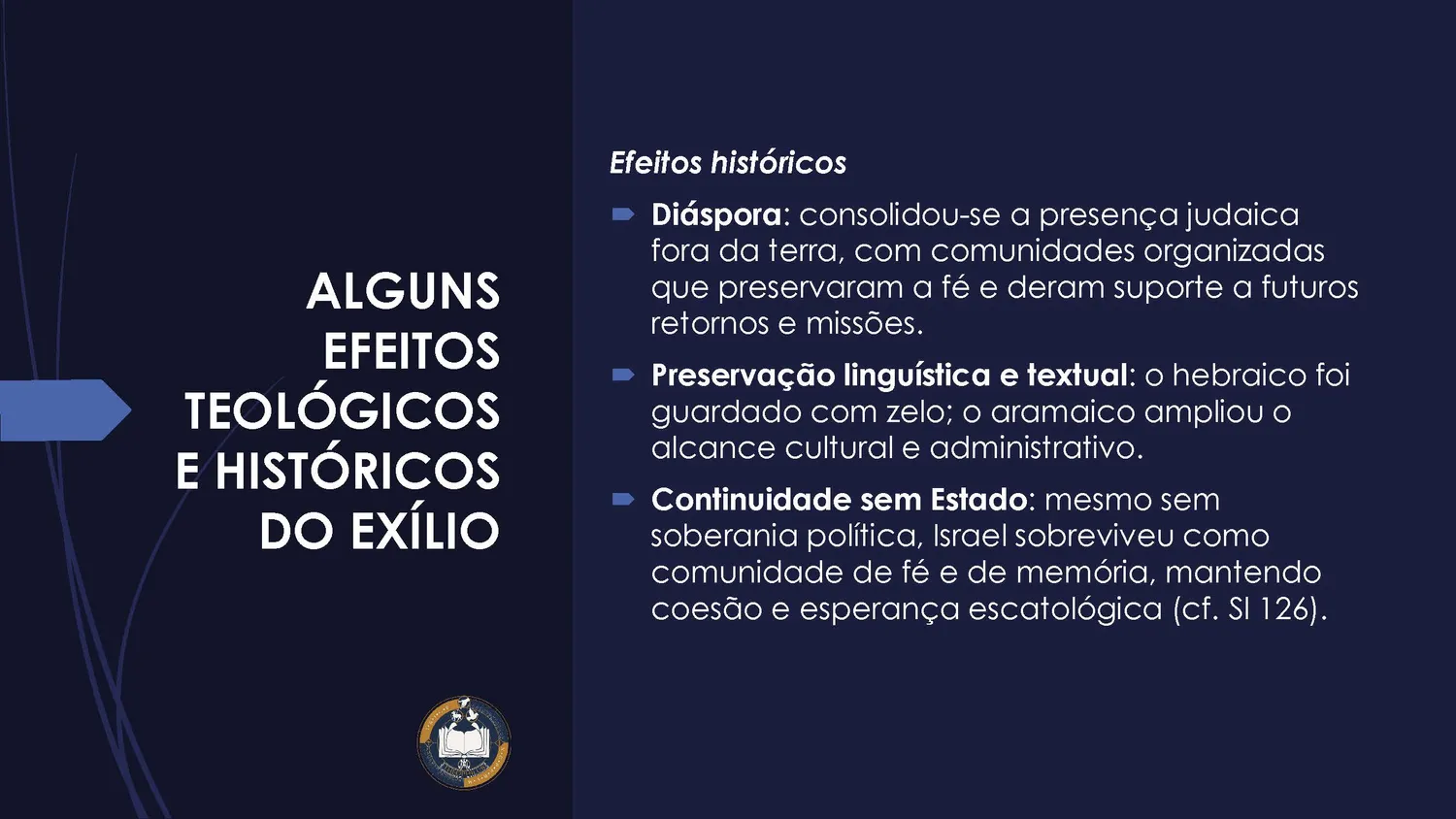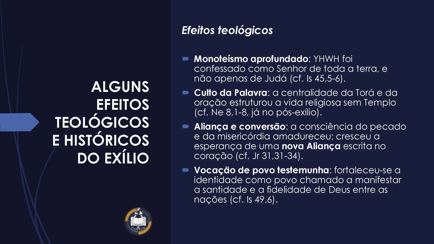 O exílio aparece como fruto da ruptura entre o povo e Deus: ao afastar-se da Lei, o povo experimenta a perda da terra, da liberdade e da estabilidade. No entanto, aquilo que parece um fracasso das promessas revela um mistério mais profundo: Deus continua agindo, mesmo no sofrimento, conduzindo a história para a salvação.