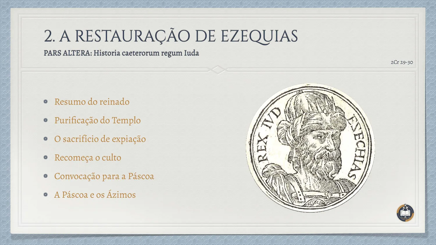Sua ação não é apenas política, mas espiritual: o culto é reorganizado, o sacerdócio restaurado e a celebração da Páscoa retomada como sinal de renovação nacional. Assim, revela-se que toda verdadeira restauração começa pelo retorno sincero a Deus.