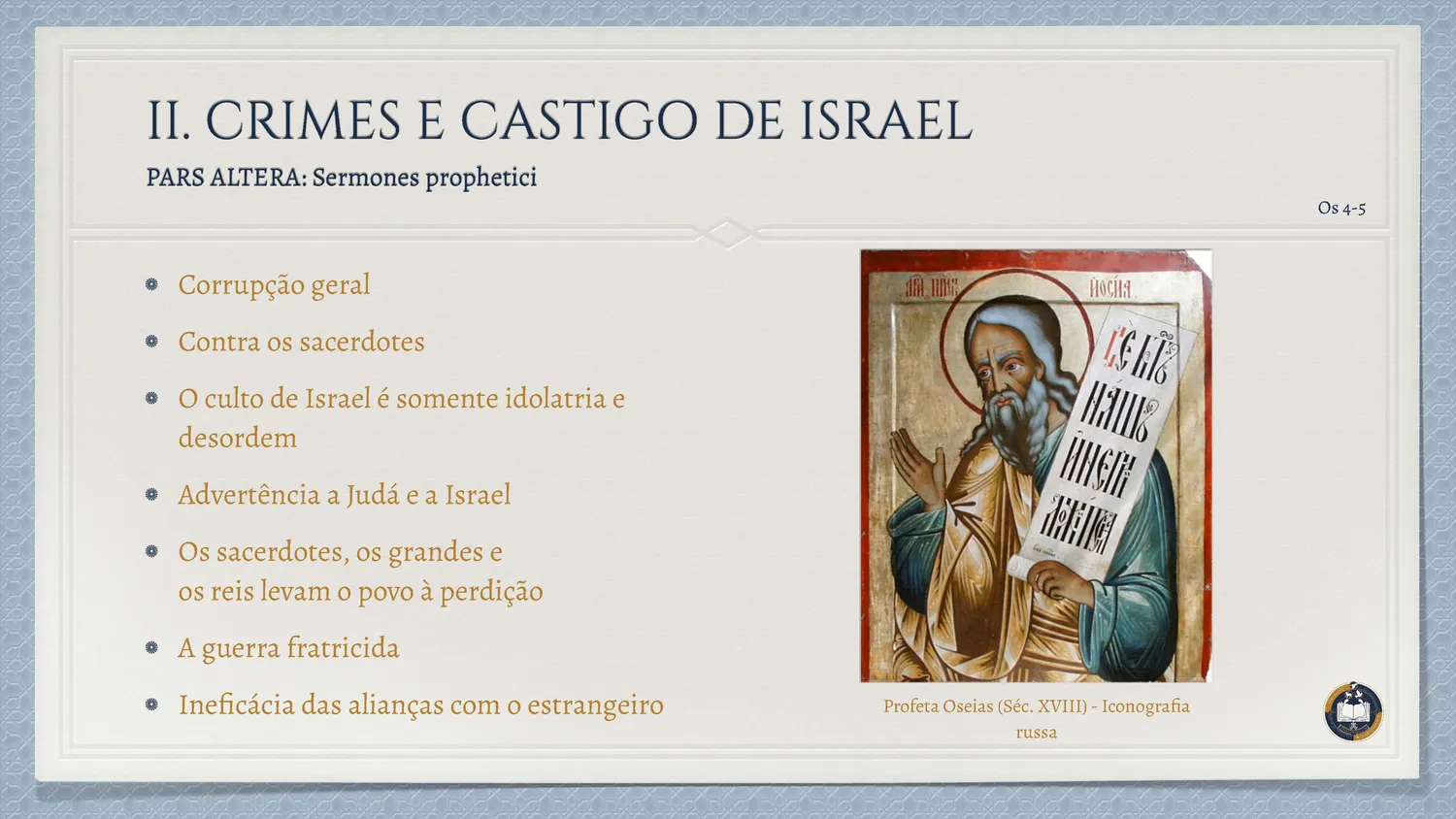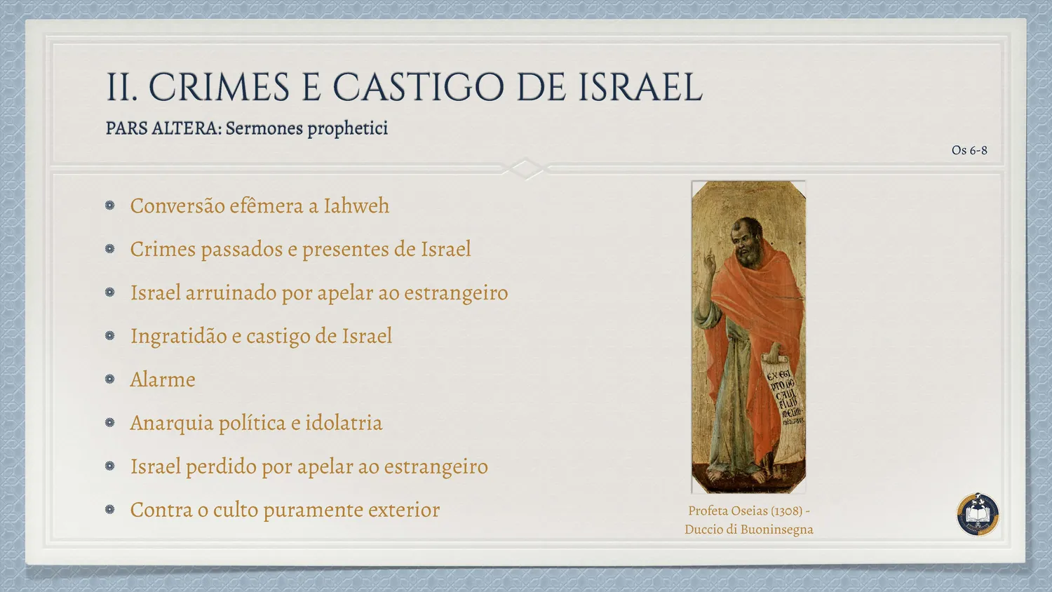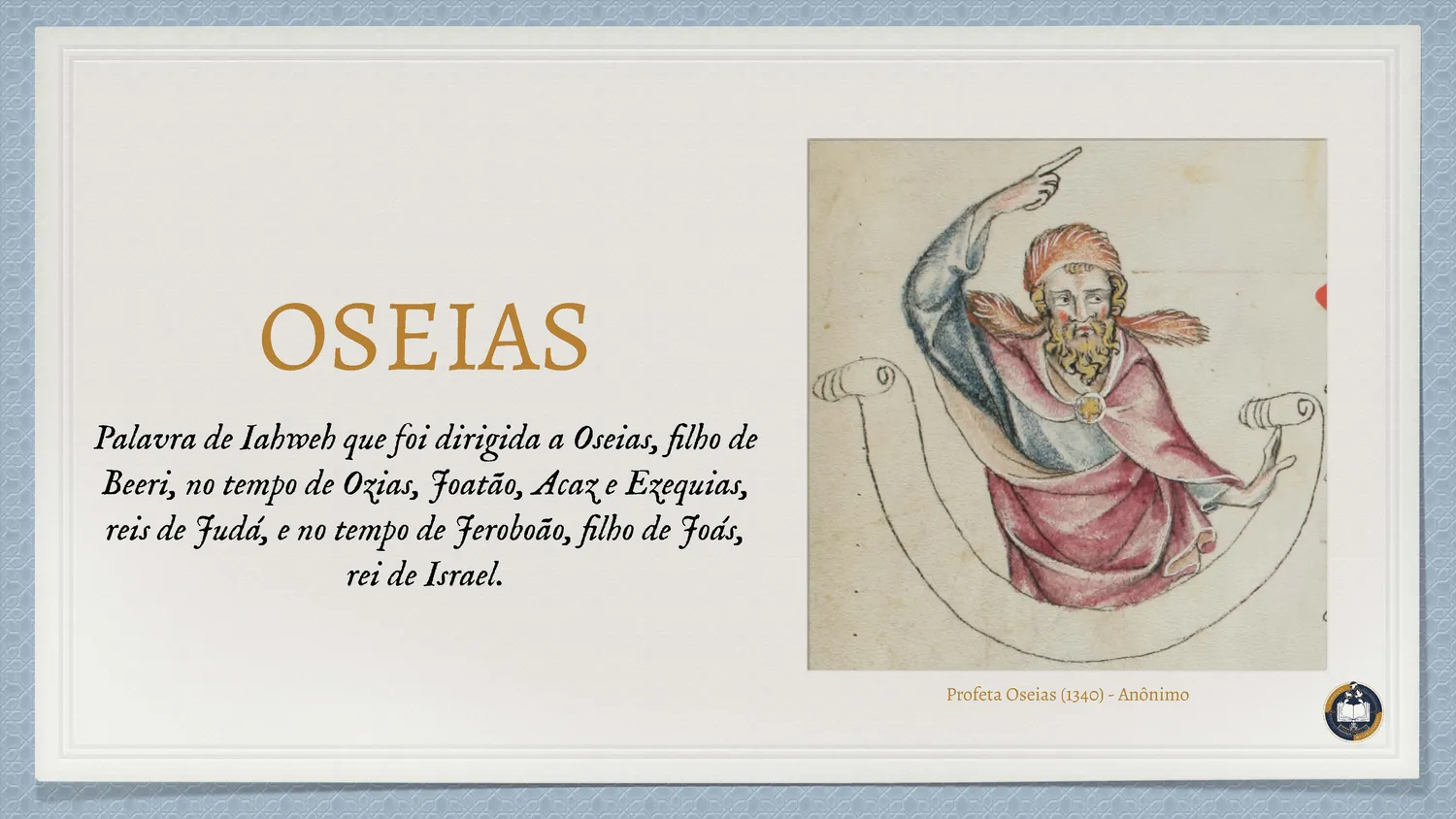 Inserido no contexto da decadência do Reino do Norte, o livro de Oseias apresenta uma das imagens mais profundas da relação entre Deus e Israel: o matrimônio. A vida do profeta torna-se sinal da Aliança, revelando a infidelidade do povo como um adultério espiritual.