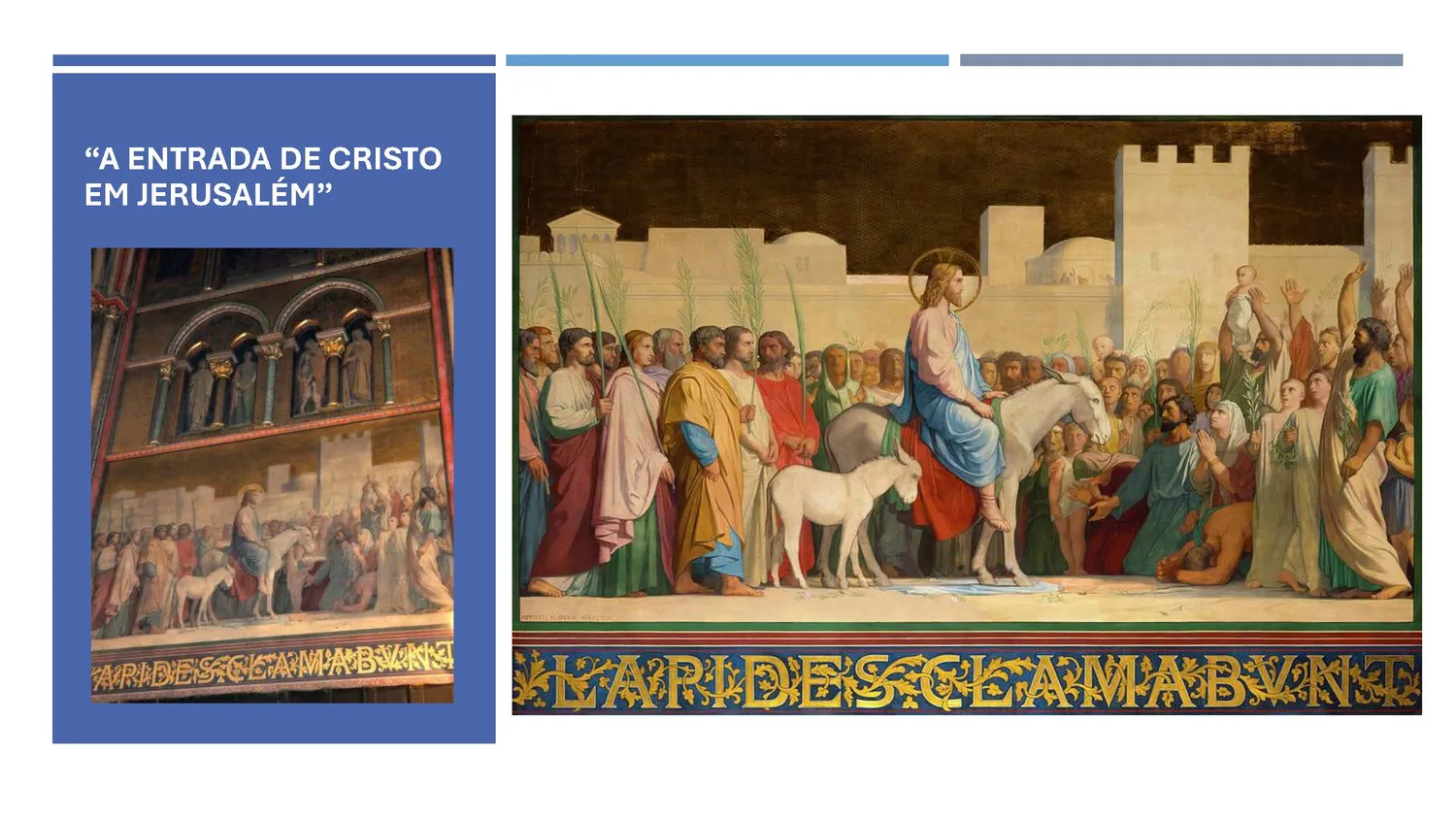 A cena apresenta Cristo no centro, montado em um jumentinho, entrando em Jerusalém para celebrar a Páscoa Judaica com seus discípulos. Ao mesmo tempo, essa entrada inaugura a nova Páscoa — a Paixão, Morte e Ressurreição.
