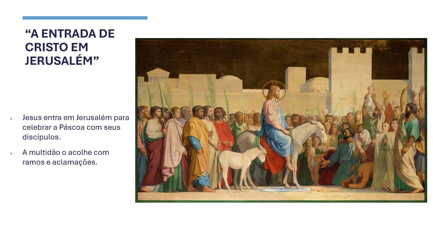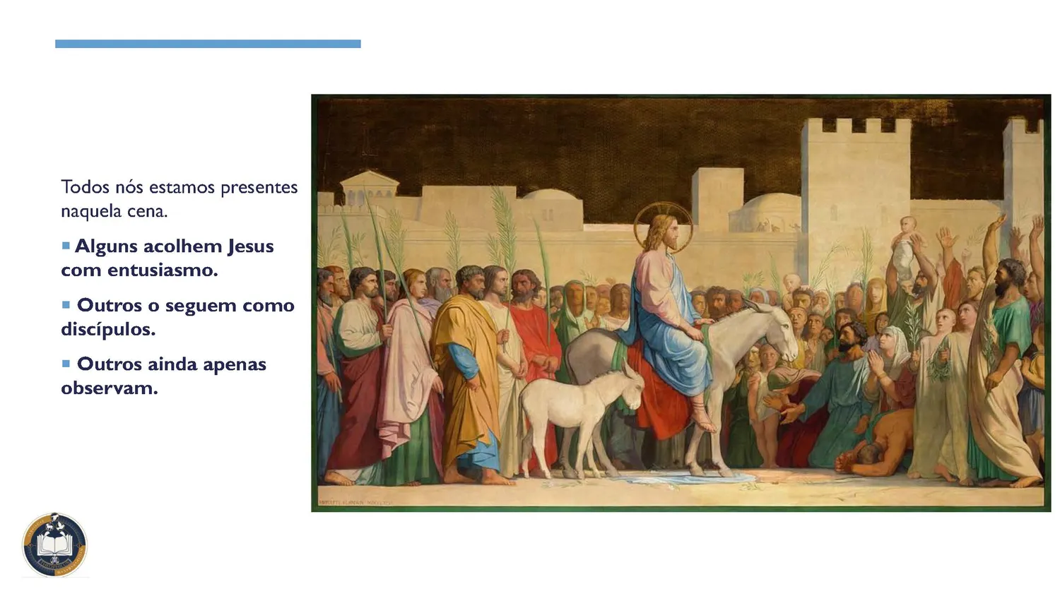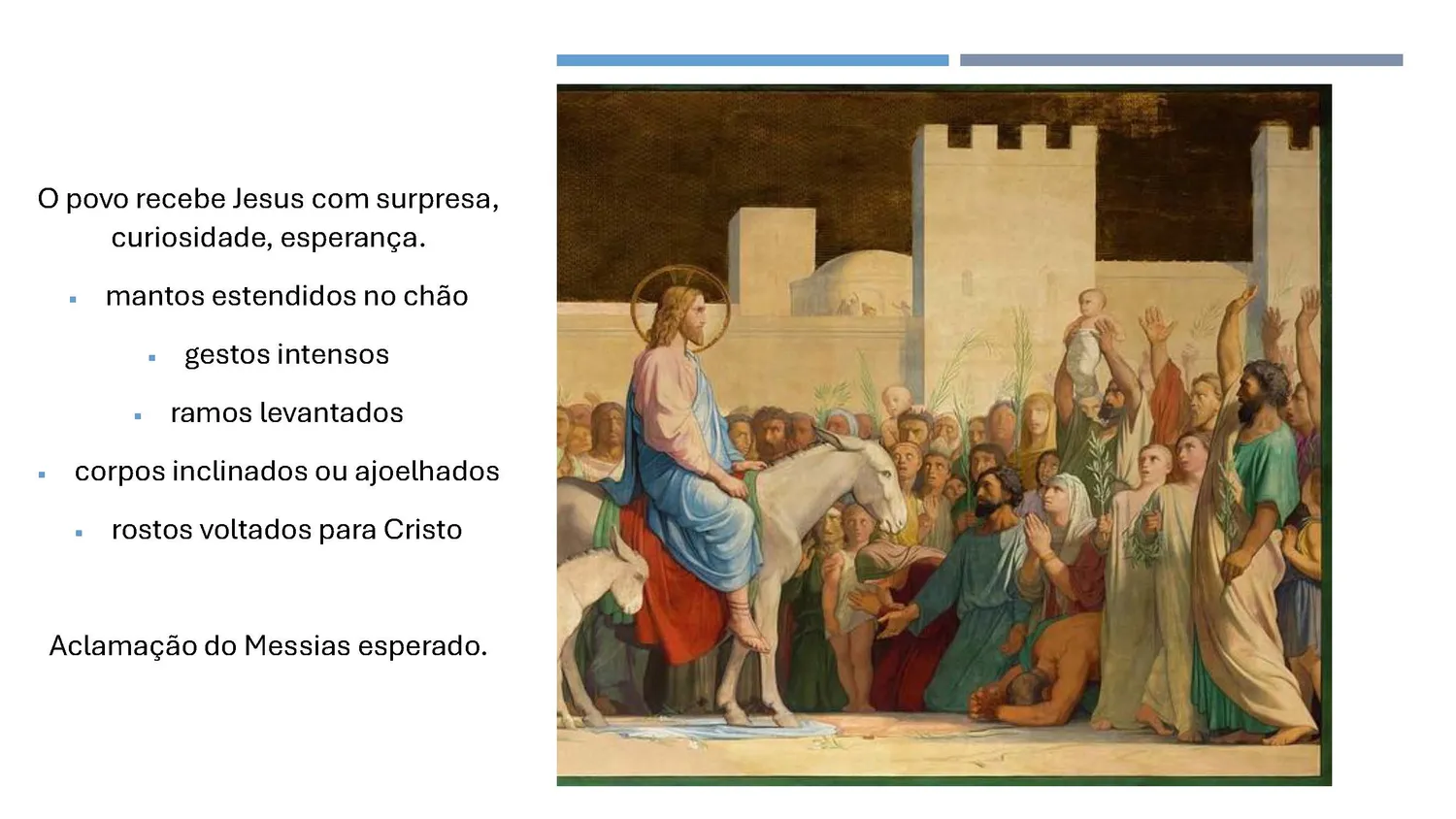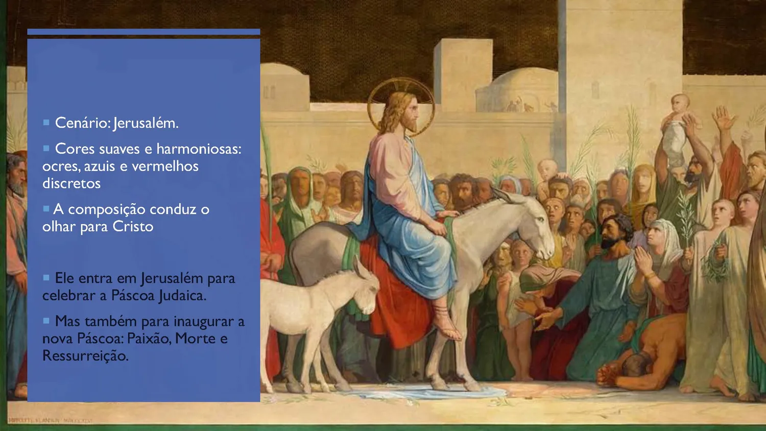 Forma-se um contraste expressivo: de um lado, a calma majestade de Jesus; de outro, o entusiasmo do povo que aclama o Messias esperado.