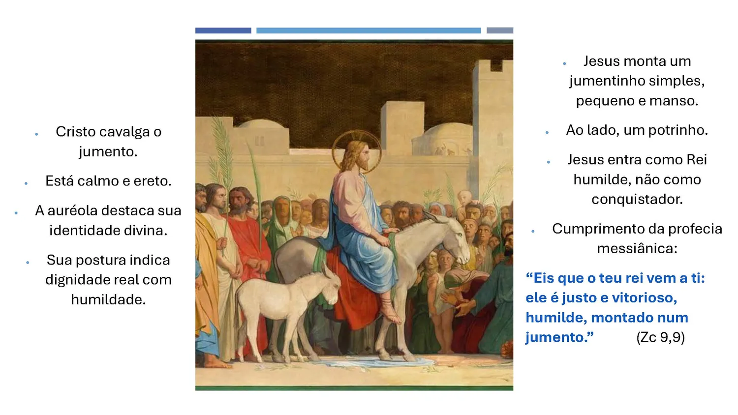 A escolha do jumento é profundamente teológica. Diferentemente do cavalo de guerra — símbolo de poder e conquista — o jumento representa paz, humildade e mansidão. A cena cumpre a profecia de Zacarias: