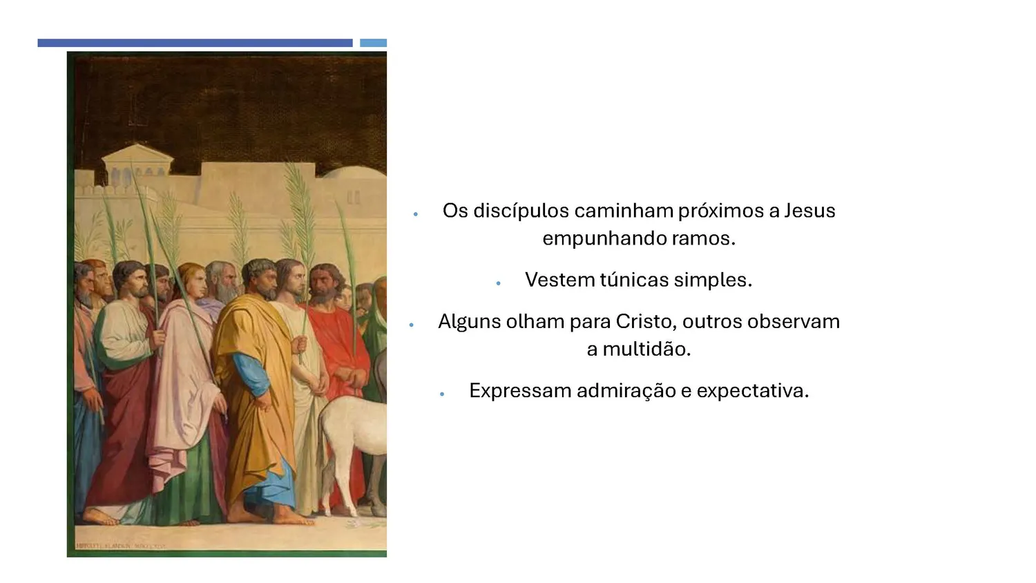 Os discípulos caminham próximos ao Mestre, vestindo túnicas simples e empunhando ramos. Alguns olham para Cristo; outros observam a multidão. Suas atitudes expressam admiração e expectativa.