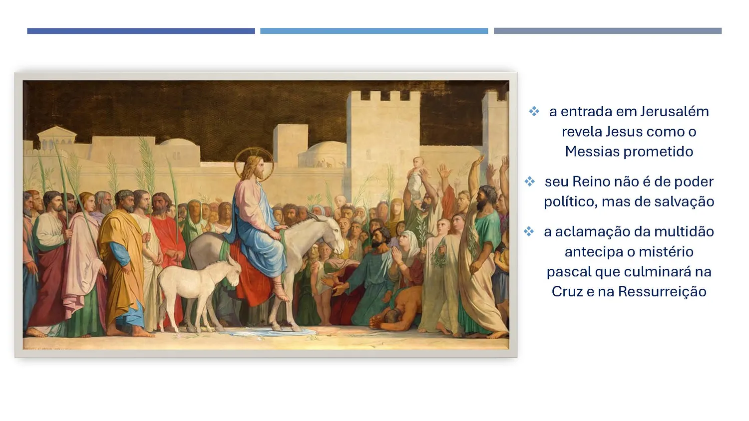 A Igreja celebra esse acontecimento no Domingo de Ramos, início da Semana Santa. A entrada em Jerusalém revela: