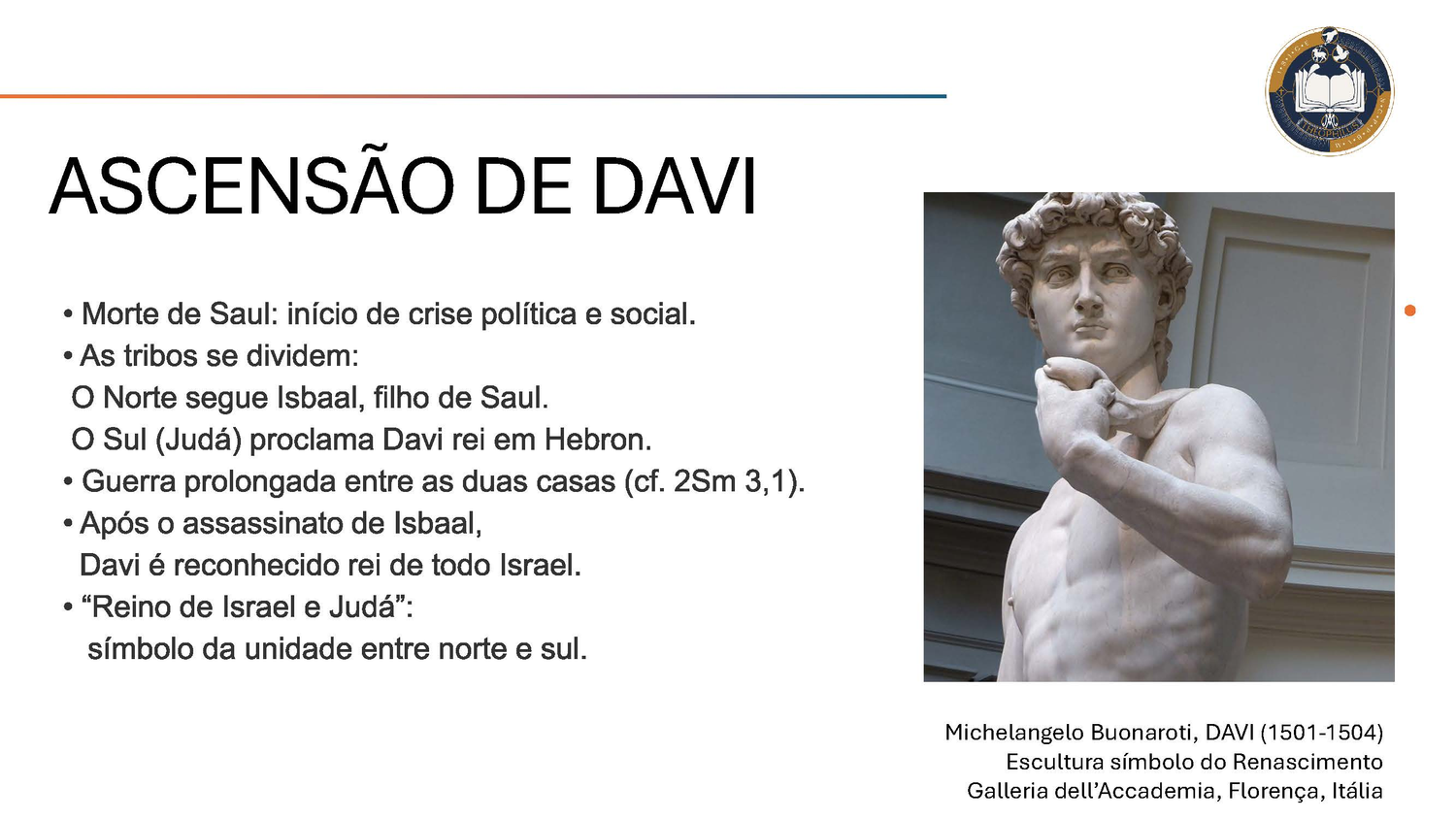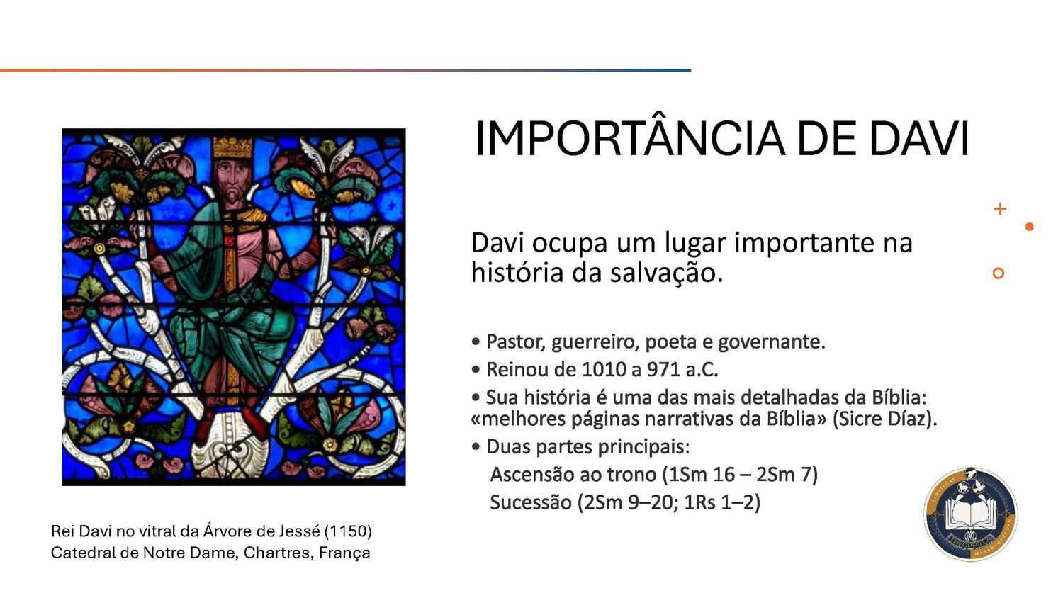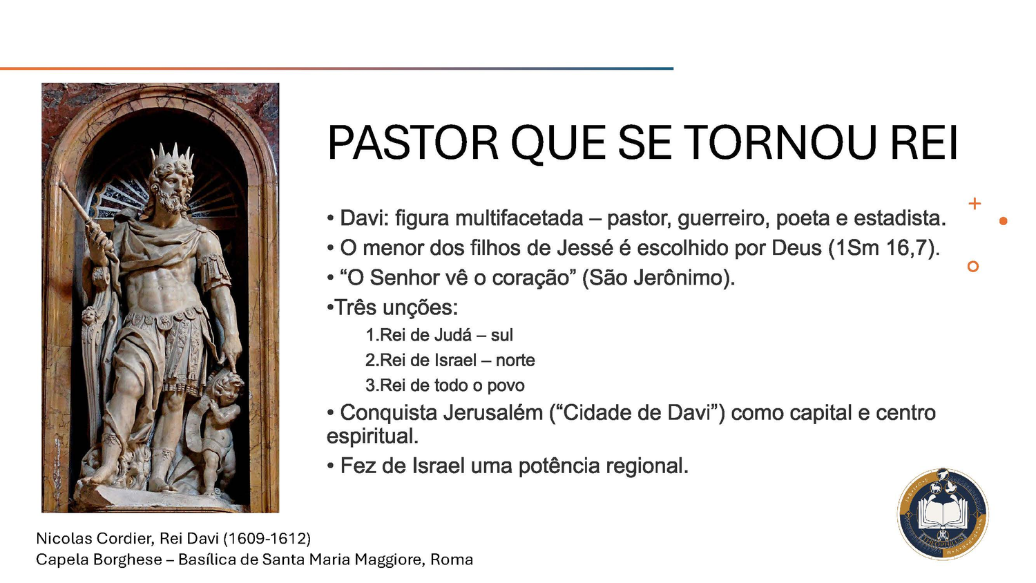 A figura de Davi é central na história da salvação. Pastor, guerreiro, poeta e rei, ele une a força humana à ternura de quem busca cumprir a vontade de Deus. Seu reinado marca o auge de Israel e inaugura de modo explícito a linhagem messiânica que culminará em Jesus Cristo. Em Davi, o poder é purificado pela fé, e o pecado transforma-se em arrependimento. Nele, a Bíblia mostra o que significa ser “homem segundo o coração de Deus”: não alguém sem falhas, mas alguém que se deixa conduzir, corrigir e restaurar pelo Senhor.