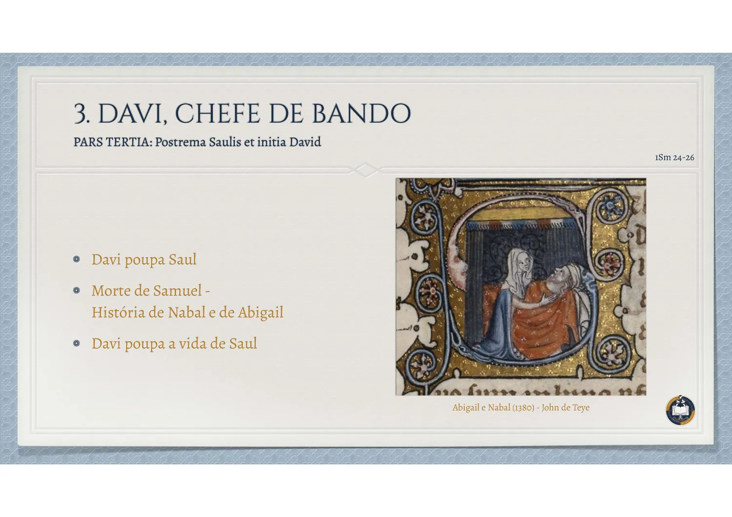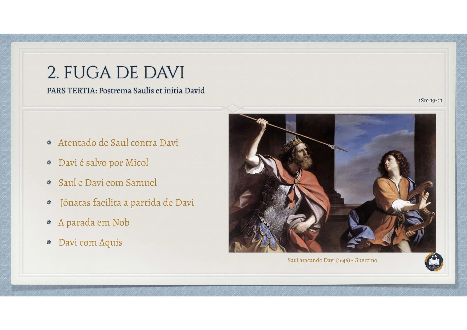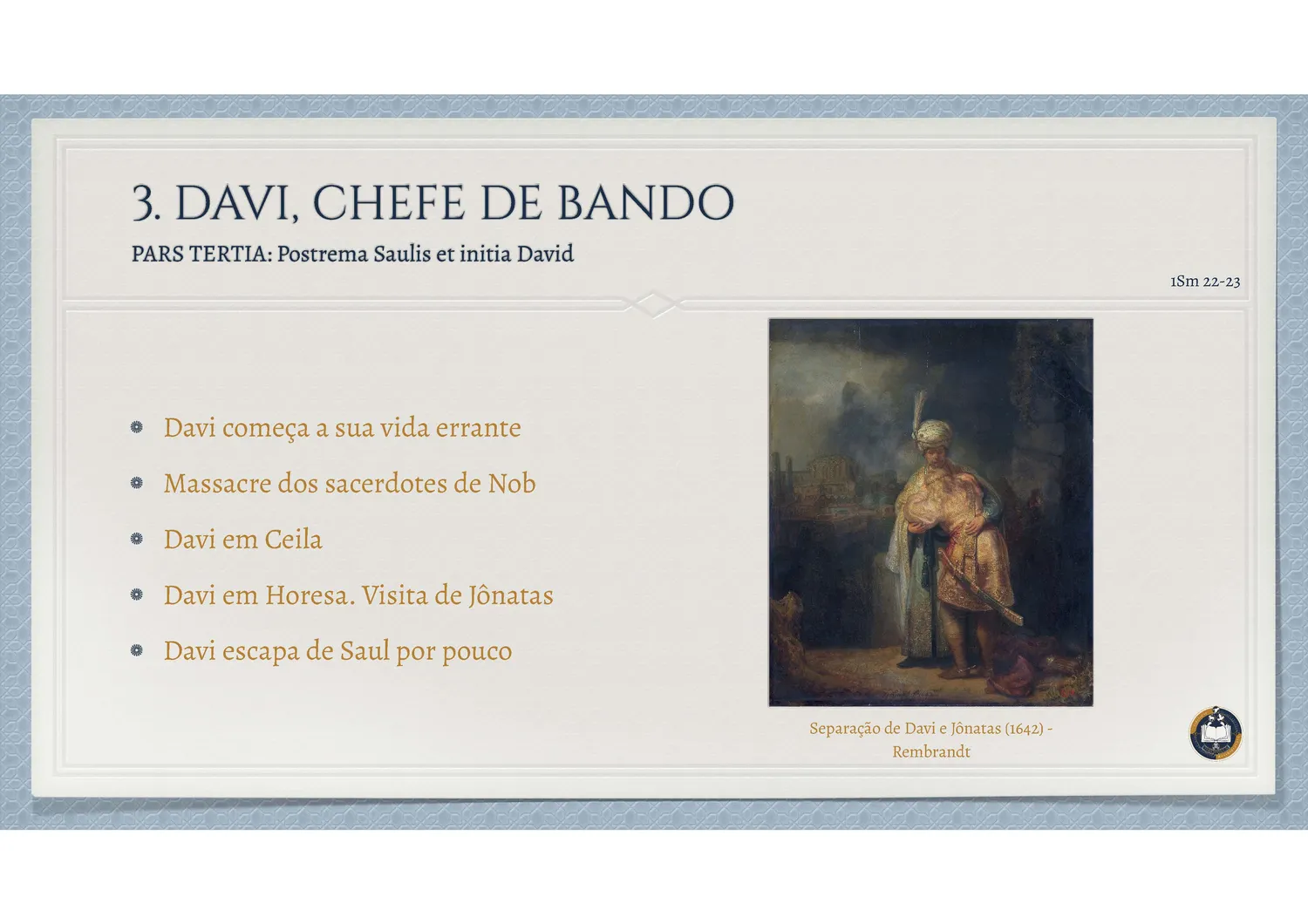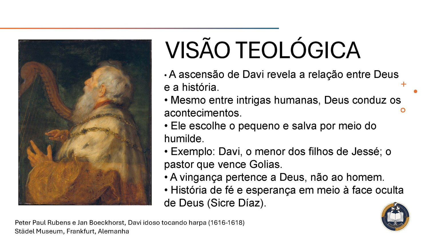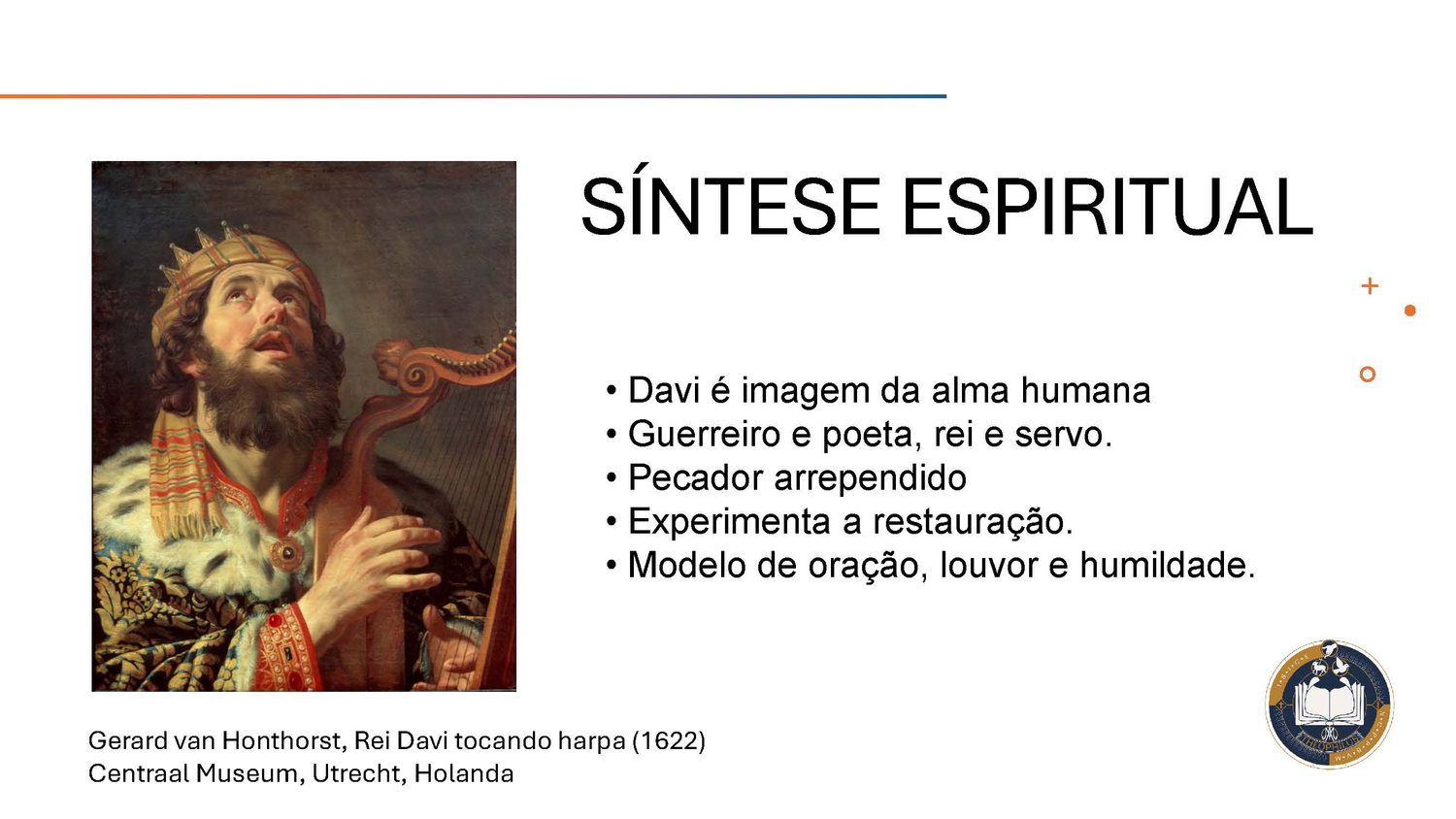 Davi reúne em si contrastes profundos: é guerreiro e poeta, rei e servo, pecador e penitente. Sua vida espelha a condição humana diante de Deus – capaz de grandes feitos e, ao mesmo tempo, vulnerável à tentação. No pastor que toca harpa, no rei que dança diante da Arca, e no homem que chora o próprio pecado, o povo de Deus reconhece a dinâmica da verdadeira conversão: um coração que sabe amar, cair, levantar-se e pedir perdão.
