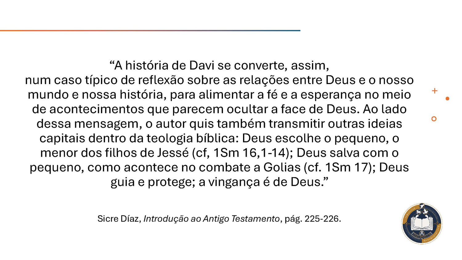 O trono de Davi torna-se, assim, símbolo da esperança messiânica. Apesar das infidelidades dos reis que o sucederam, Deus permanece fiel. A promessa não está condicionada à perfeição de cada descendente, mas à fidelidade do próprio Deus ao seu plano de amor. A monarquia davídica se torna fio condutor da história de Israel, apontando para um Rei definitivo e eterno.