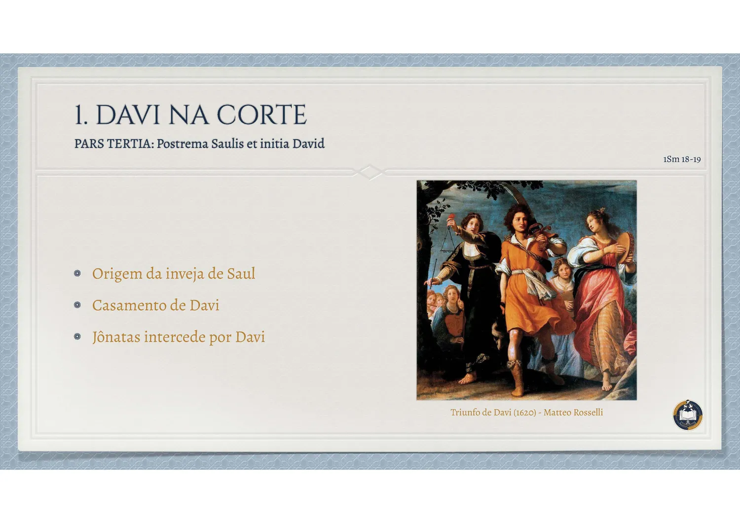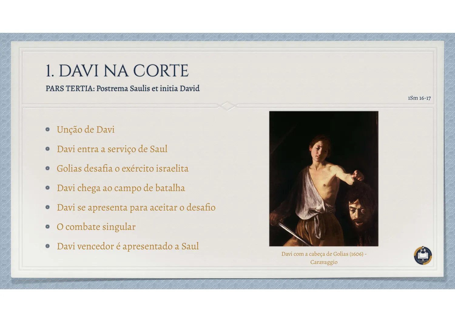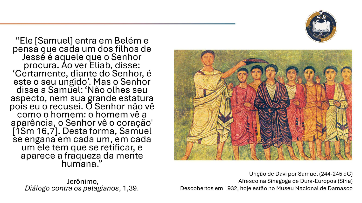 Davi aparece primeiro como pastor de ovelhas, simples e quase esquecido na casa de Jessé. Aos olhos humanos, seus irmãos pareciam mais adequados à realeza, mas Deus escolhe aquele que ninguém esperava. São Jerônimo recorda que Samuel, ao ver os filhos de Jessé, se engana um a um, até ouvir de Deus: “O Senhor não vê como o homem: o homem vê a aparência, mas o Senhor vê o coração” (1Sm 16,7). Nesse contraste, revela-se a fraqueza do julgamento humano e a surpresa da eleição divina.