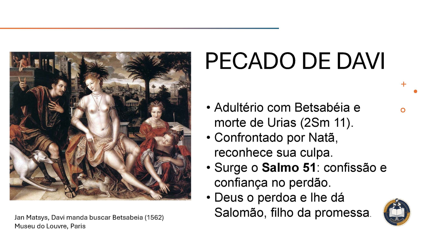 Embora profundamente religioso, Davi não é isento de quedas graves. O episódio com Betsabeia e o assassinato de Urias (2Sm 11) marca uma das páginas mais sombrias de sua vida. Confrontado pelo profeta Natã, Davi não se justifica: reconhece o próprio pecado e se humilha diante de Deus. Da sua dor nasce o Salmo 51 (50), uma das mais belas expressões bíblicas de contrição: “Tem piedade de mim, ó Deus, segundo a tua misericórdia… eu reconheço a minha iniquidade”.