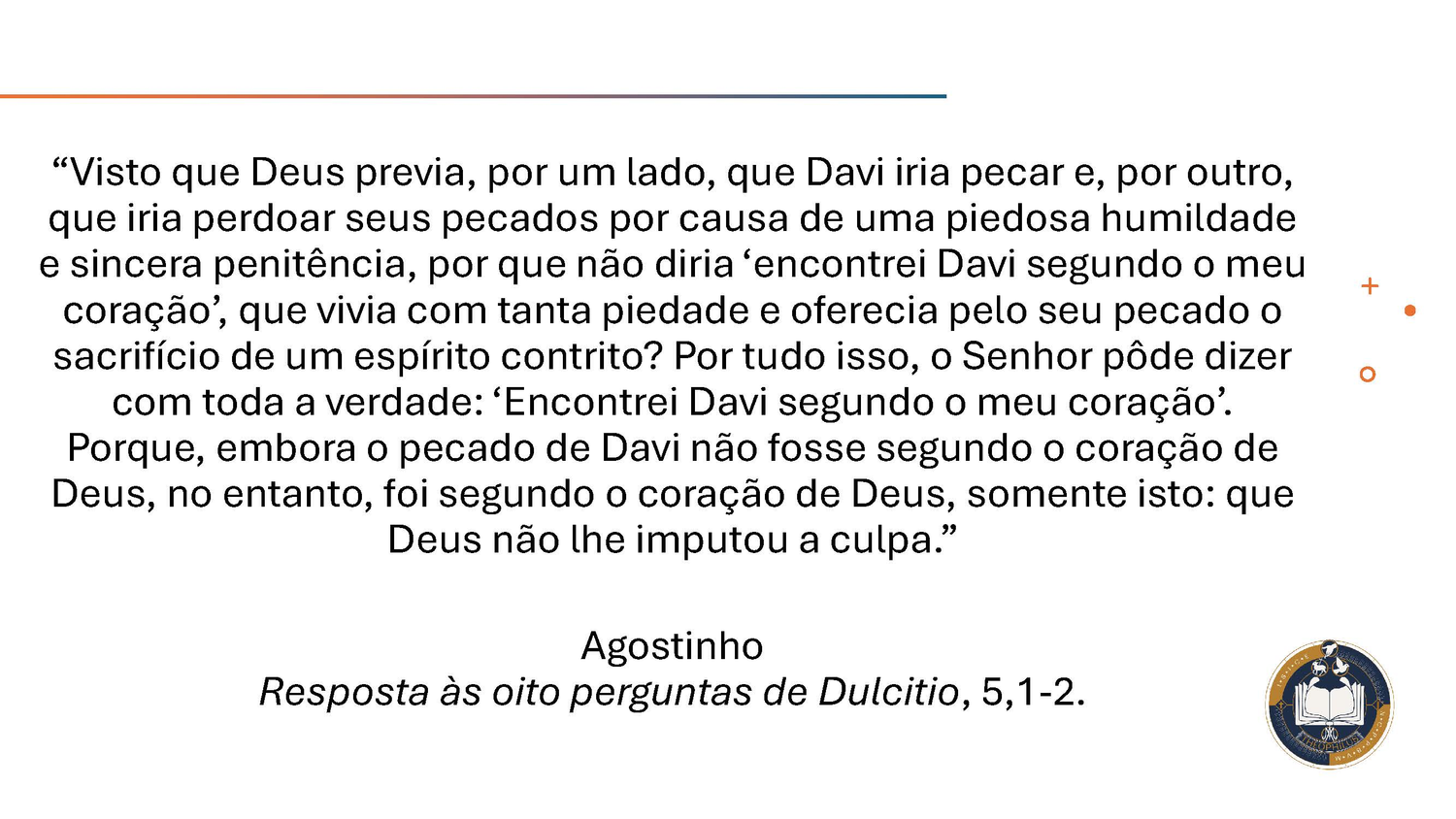 Deus castiga o pecado, mas não retira sua misericórdia. Davi é perdoado, ainda que sofra as consequências de sua falta, e é de sua união com Betsabeia que nascerá Salomão, o filho da promessa (2Sm 12,24-25). Santo Agostinho explica que Deus, prevendo tanto o pecado quanto a penitência de Davi, pode dizer com verdade que encontrou em Davi um homem “segundo o seu coração”: não porque o pecado fosse conforme à vontade de Deus, mas porque a humildade, o coração contrito e a disposição de deixar-se perdoar são o que Deus realmente olha e não lhe imputa a culpa.