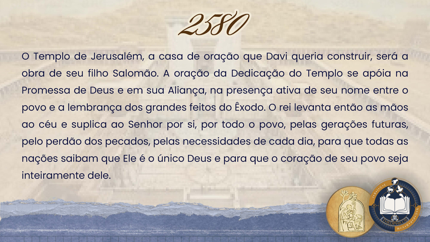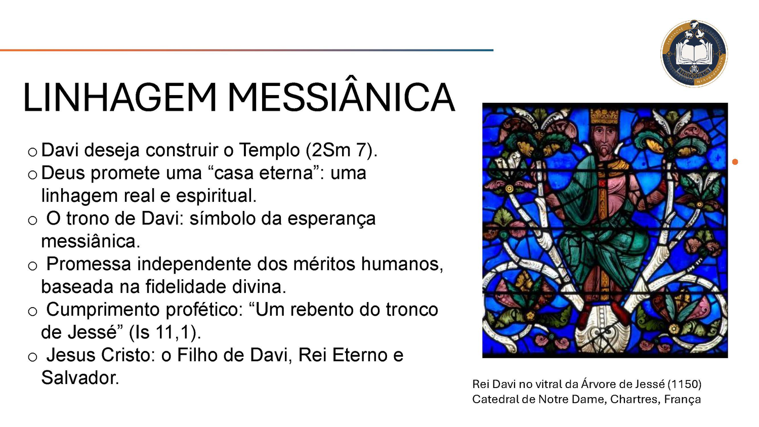 Quando Davi deseja construir um Templo para o Senhor (2Sm 7), recebe uma resposta surpreendente. Não será ele quem erguerá uma casa de pedra para Deus; ao contrário, Deus promete construir para Davi uma “casa” duradoura, isto é, uma dinastia: “O Senhor te fará uma casa, e o teu trono será firme para sempre” (cf. 2Sm 7,11-16). Esta é a Aliança Davídica, momento-chave da revelação, em que a promessa feita a Abraão se aprofunda: agora, a bênção para todas as nações passa pela descendência real de Davi.