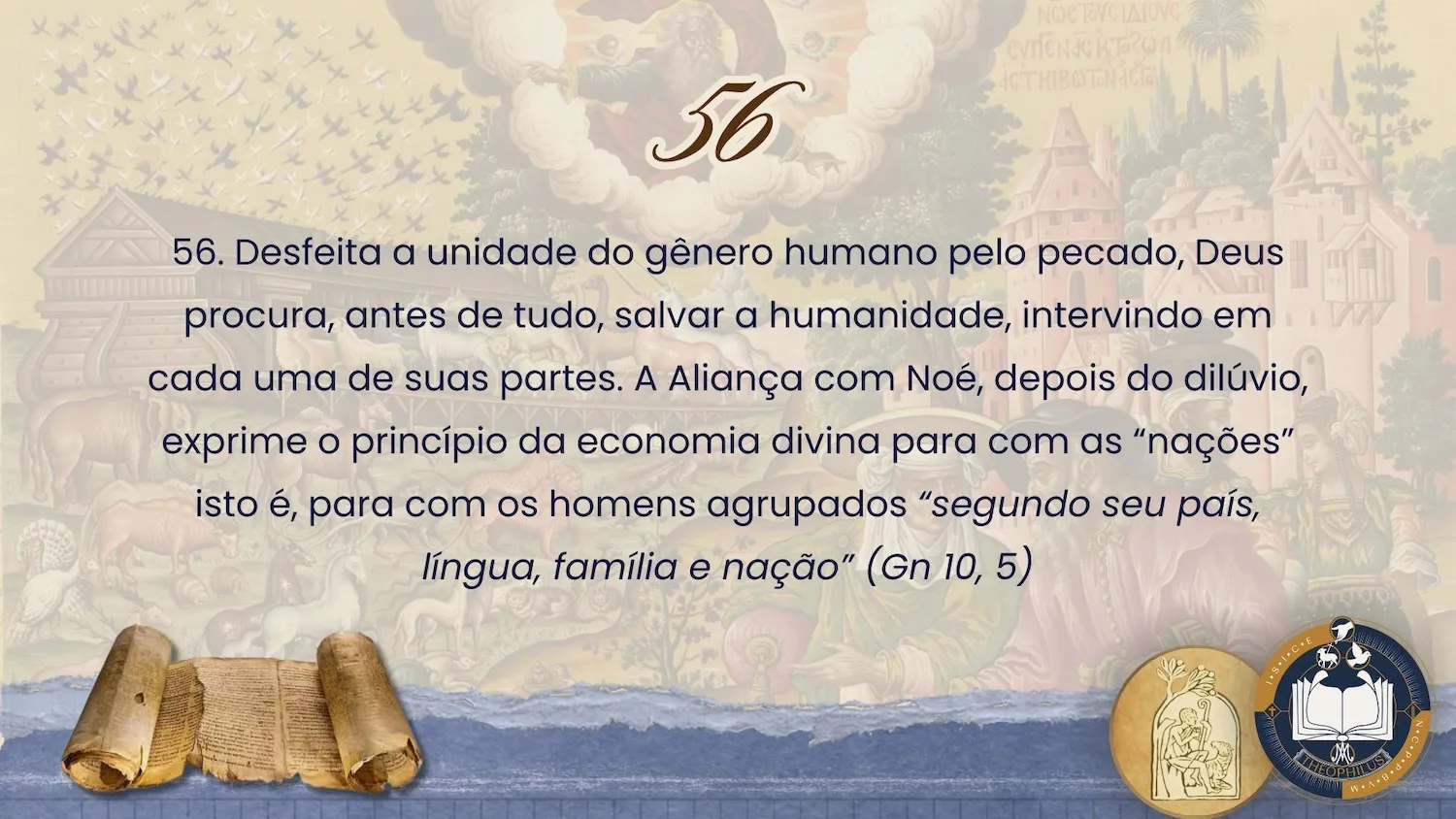 Nos parágrafos 56–61 o Catecismo apresenta a progressiva revelação da economia da salvação. Deus, ao desfazer a unidade do gênero humano pelo pecado, não abandona a humanidade, mas intervém para salvá-la em cada uma de suas partes. A aliança com Noé inaugura uma relação universal, aberta a todos os povos. Com Abraão, Deus escolhe um povo específico, chamado a ser bênção para todas as nações e raiz de onde brotará a Igreja.