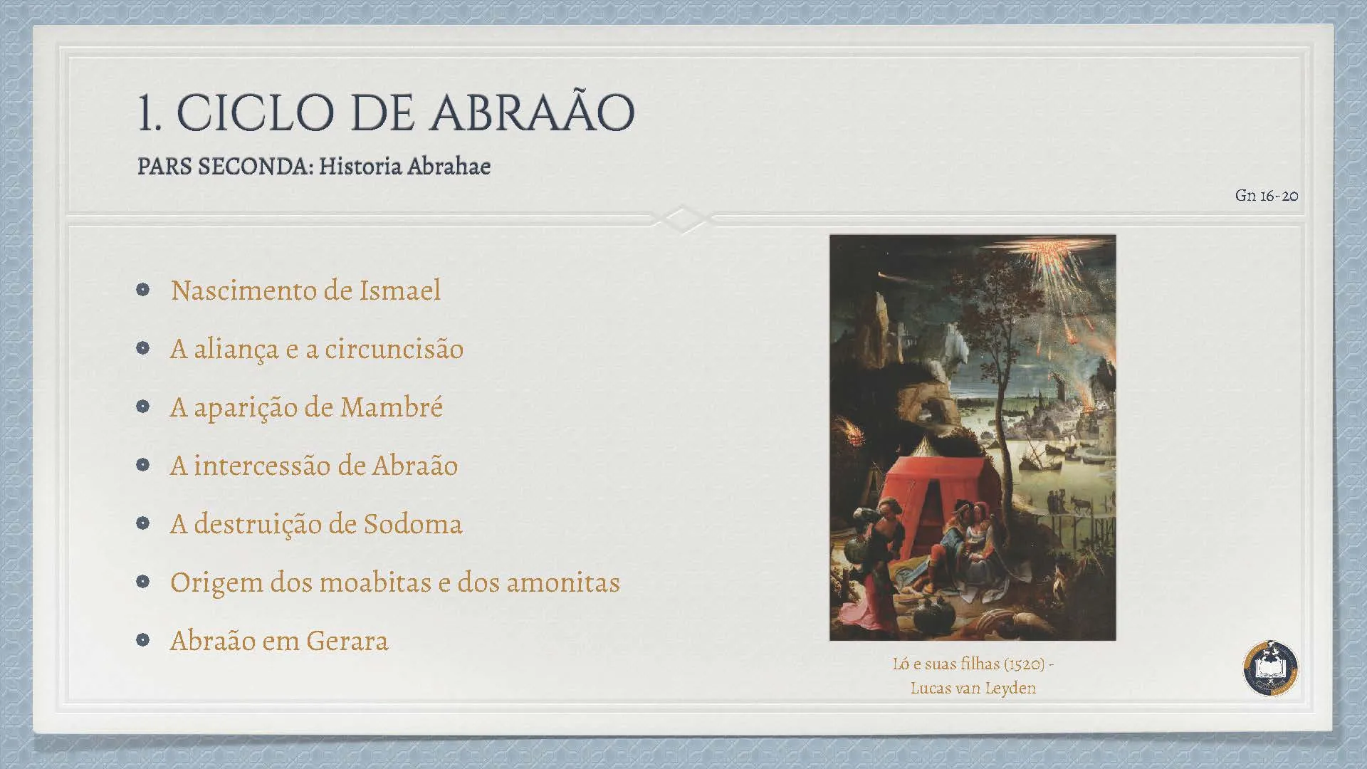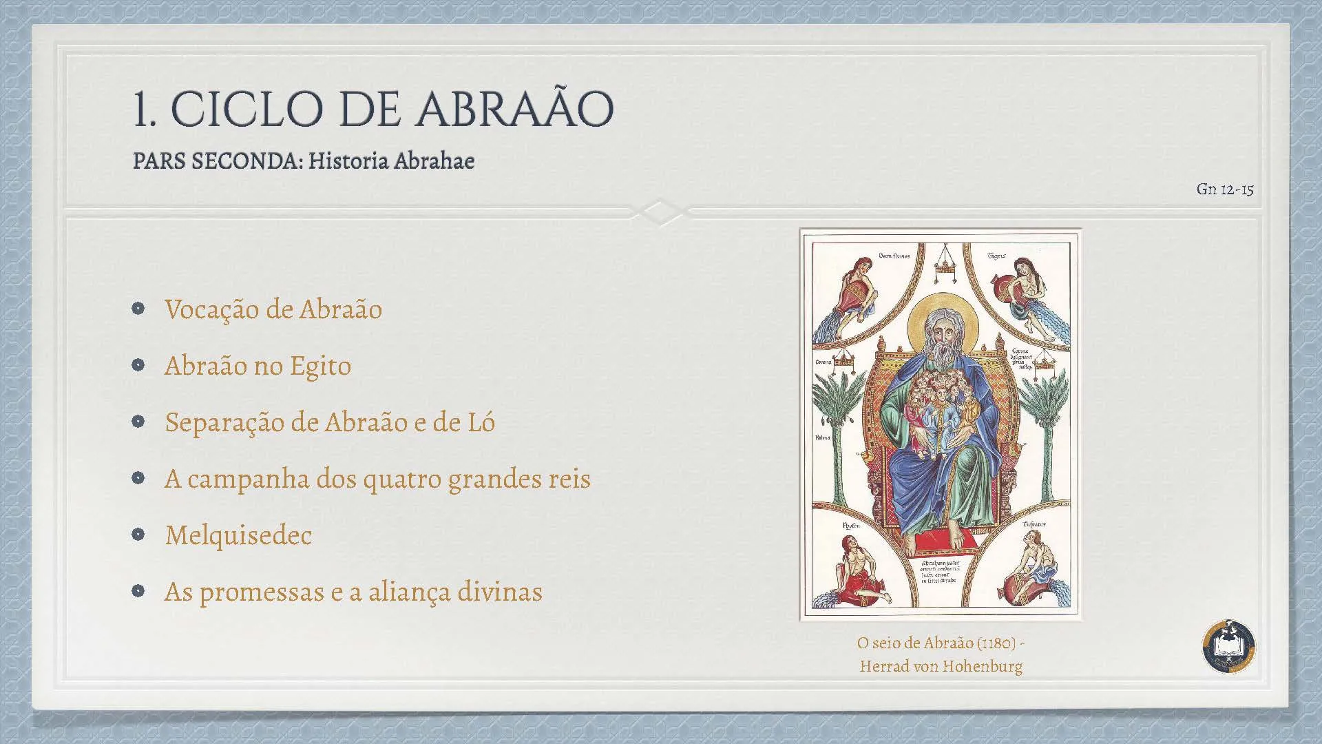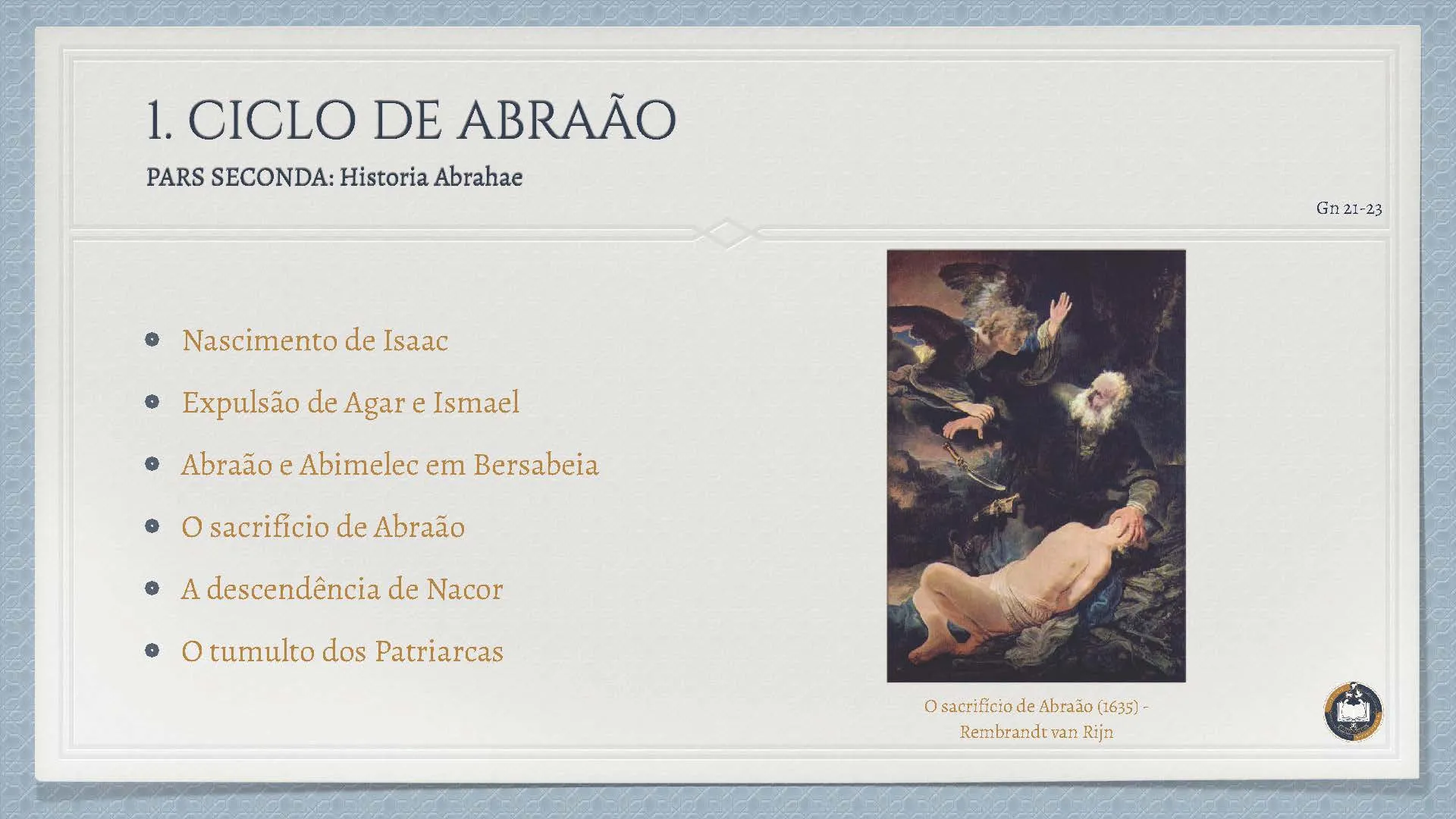 • Ciclo de Abraão (Gn 12–25): vocação; promessas de terra e descendência; aliança e circuncisão; intercessão por Sodoma; nascimento de Isaac; sacrifício de Abraão; morte e sepultamento.