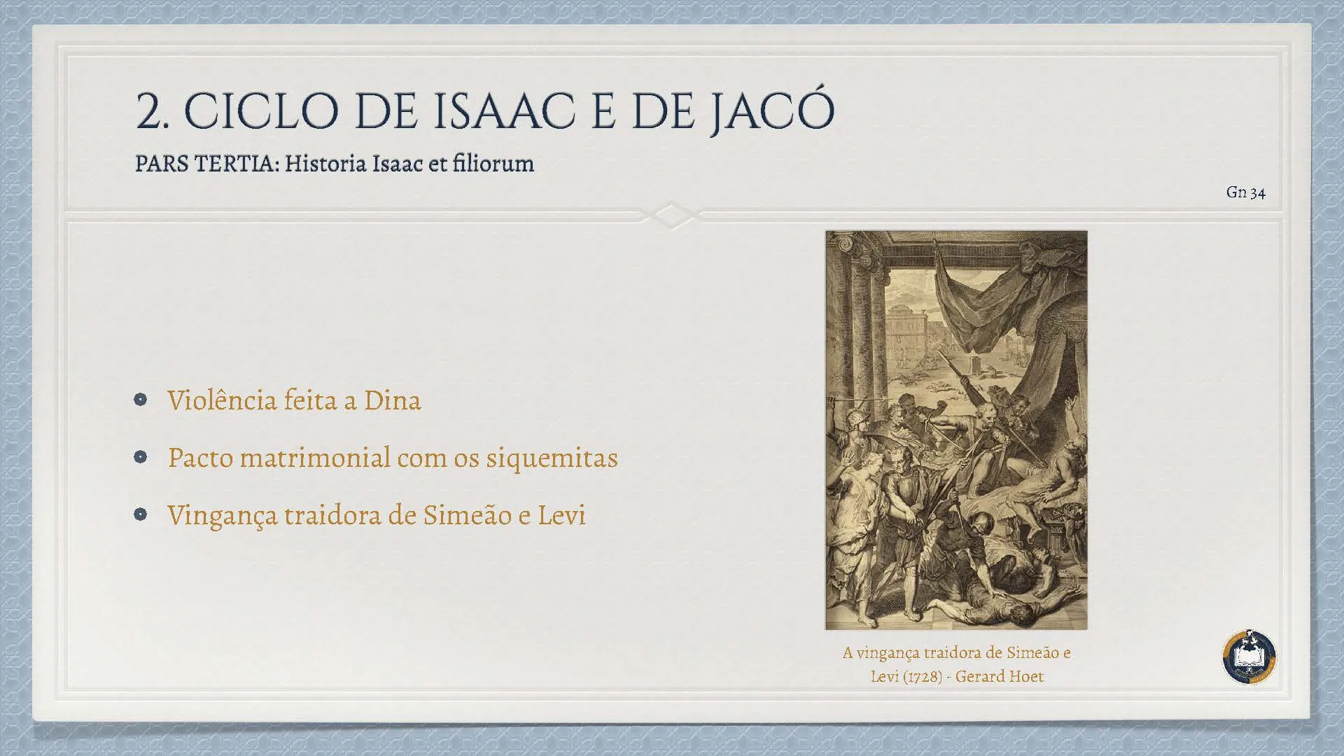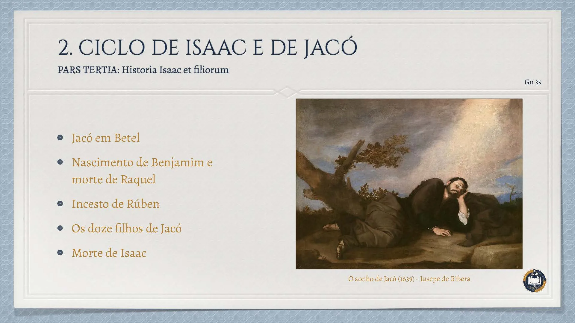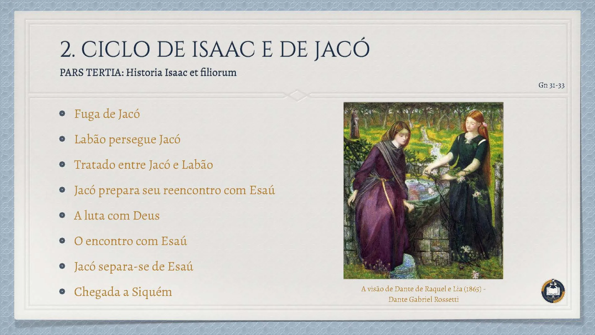 • Ciclo de Isaac e Jacó (Gn 25–36): nascimento dos gêmeos Esaú e Jacó; disputa pela primogenitura; sonho de Jacó; casamentos e filhos; luta com Deus; reconciliação com Esaú; violência em Siquém; doze tribos de Israel.