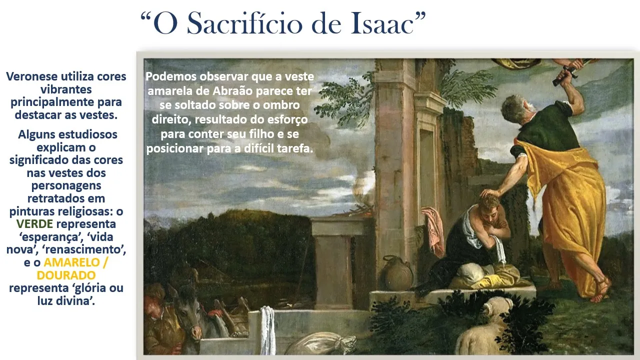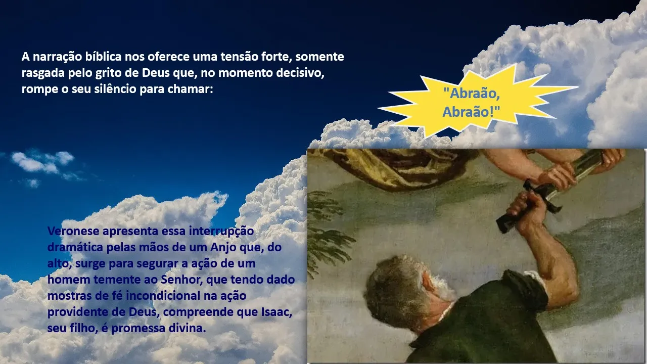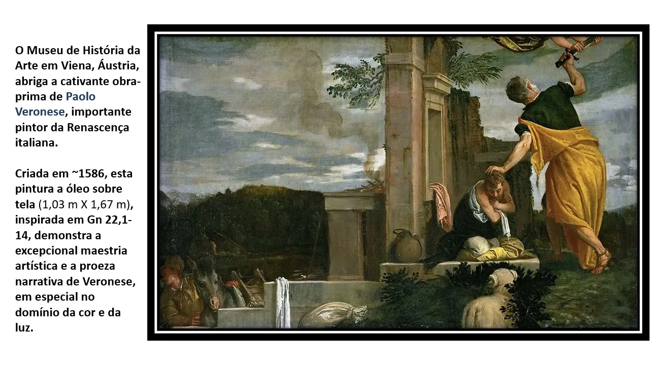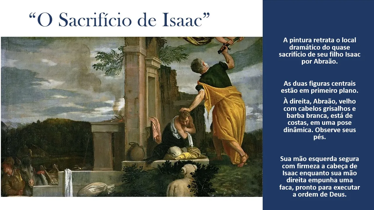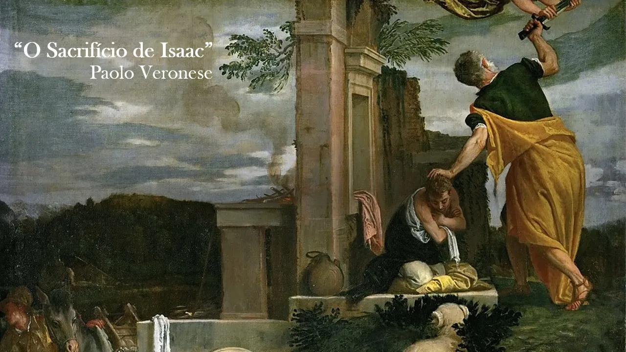 Na obra de Paolo Veronese (c. 1586), intitulada O Sacrifício de Isaac, vemos representada uma das passagens mais intensas do Gênesis (Gn 22,1-14). O artista retrata o momento dramático em que Abraão, obediente à voz de Deus, ergue a faca para imolar seu filho Isaac, sendo interrompido pelo anjo que anuncia a intervenção divina. A cena expressa a radicalidade da fé e a confiança absoluta no Senhor, mesmo diante de uma provação extrema.