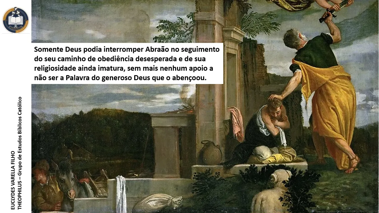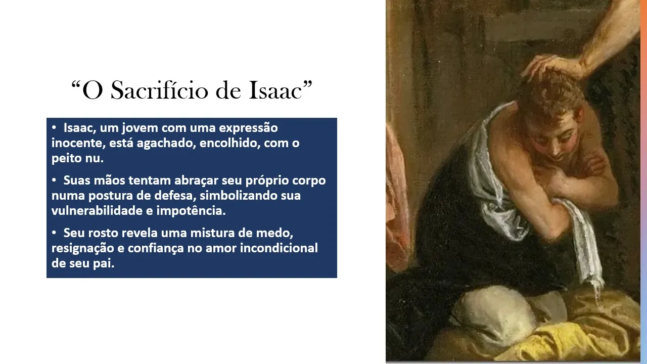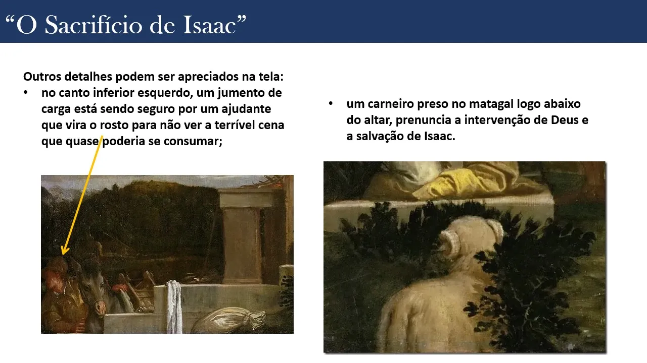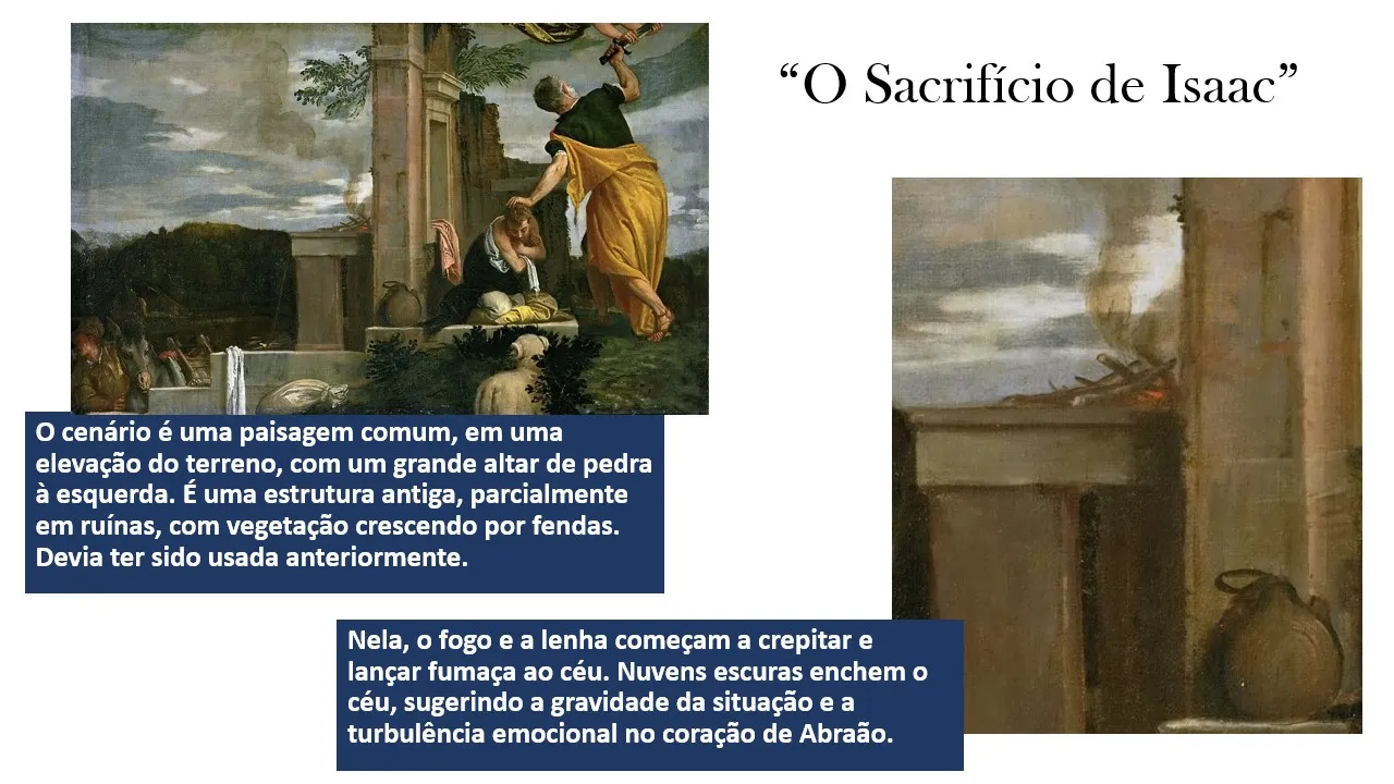 No fundo, os elementos narrativos reforçam a mensagem bíblica: o carneiro preso no matagal, que será oferecido em lugar de Isaac; o altar em ruínas, fumegando; as nuvens carregadas que traduzem a tensão espiritual. Tudo culmina no clamor divino – “Abraão, Abraão!” – que interrompe a ação e confirma a promessa: a fé obediente gera bênção e descendência.