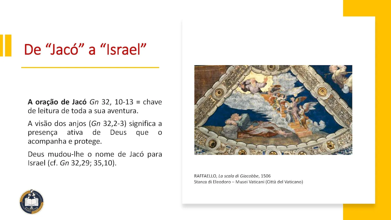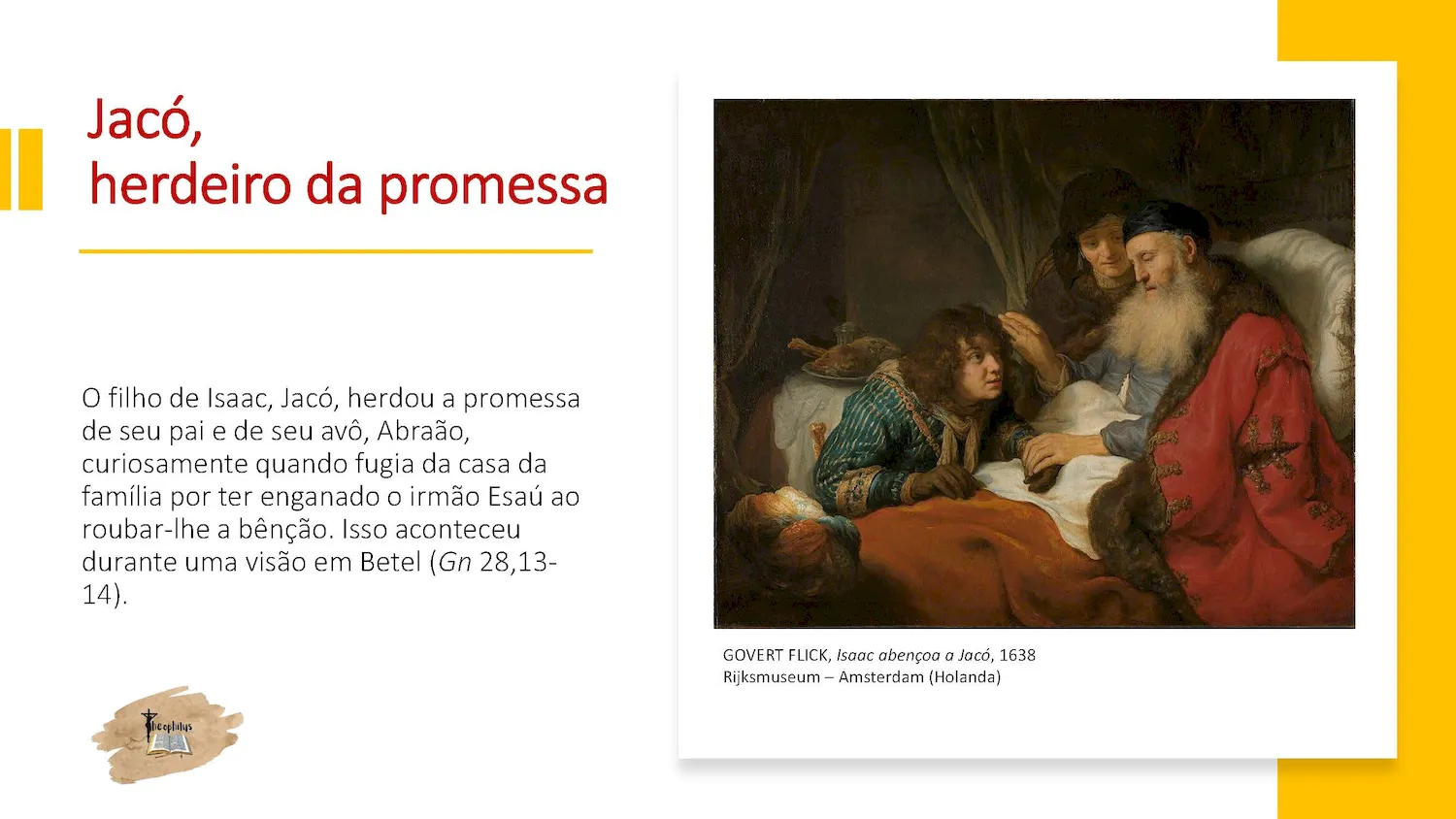 • Jacó (Gn 27–36): herda a bênção de Isaac. De enganador torna-se Israel, pai das 12 tribos. Sua luta com Deus revela a transformação pela graça.